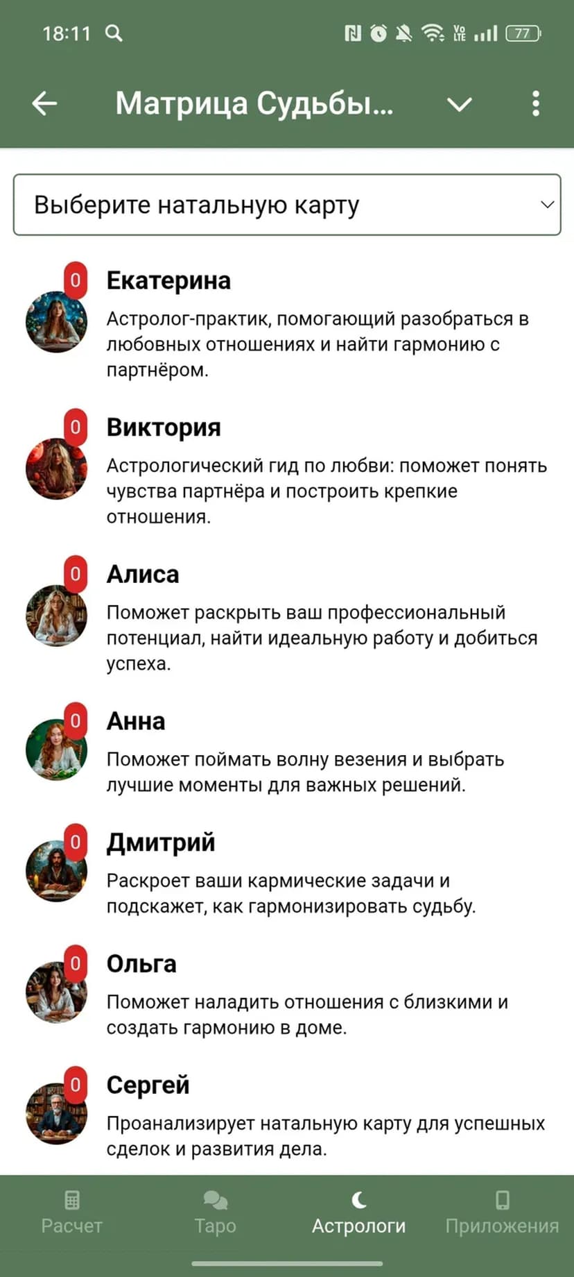Интуитивное меню объединяет три раздела — Матрица Судьбы, Таро и Натальная карта. Каждый раздел выполняет расчёт или расклад по дате рождения либо по выбранному запросу; навигация реализована с помощью кнопок, интерфейс выполнен в едином стиле, предусмотрена круглосуточная поддержка пользователей.