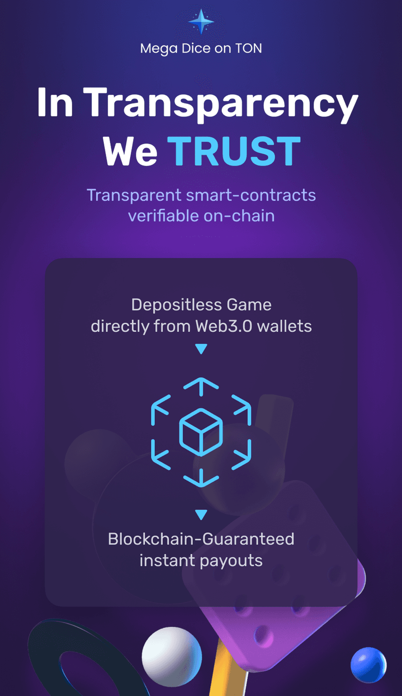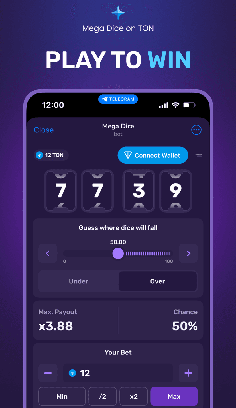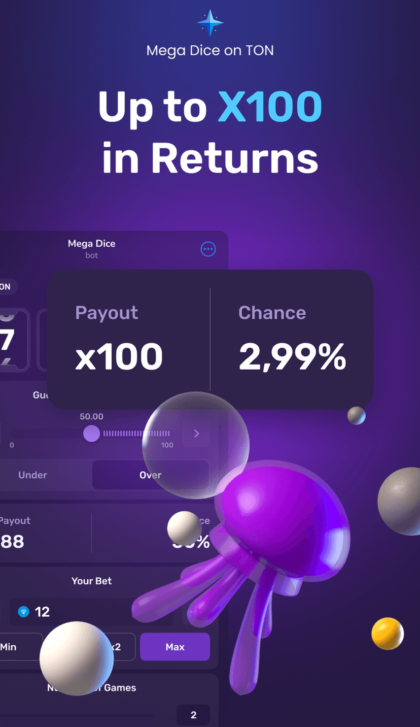 Megadice предлагает быстрые азартные ставки в TON: выбирайте исход броска кубика — «больше» или «меньше», ставьте в TON и сразу получайте результат и выплату.