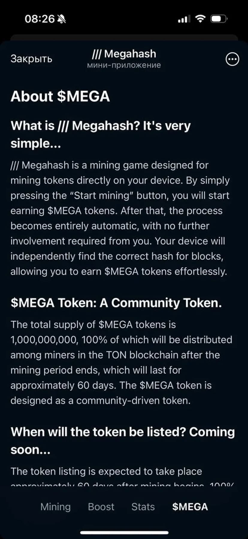 Эмиссия в объёме 1 000 000 000 $MEGA будет распределена между участниками в течение 60 дней; по окончании периода добыча прекращается. Приложение ориентировано на аудиторию, интересующуюся криптоиграми и экосистемой TON, и выделяется прозрачной системой распределения токенов и простотой использования.