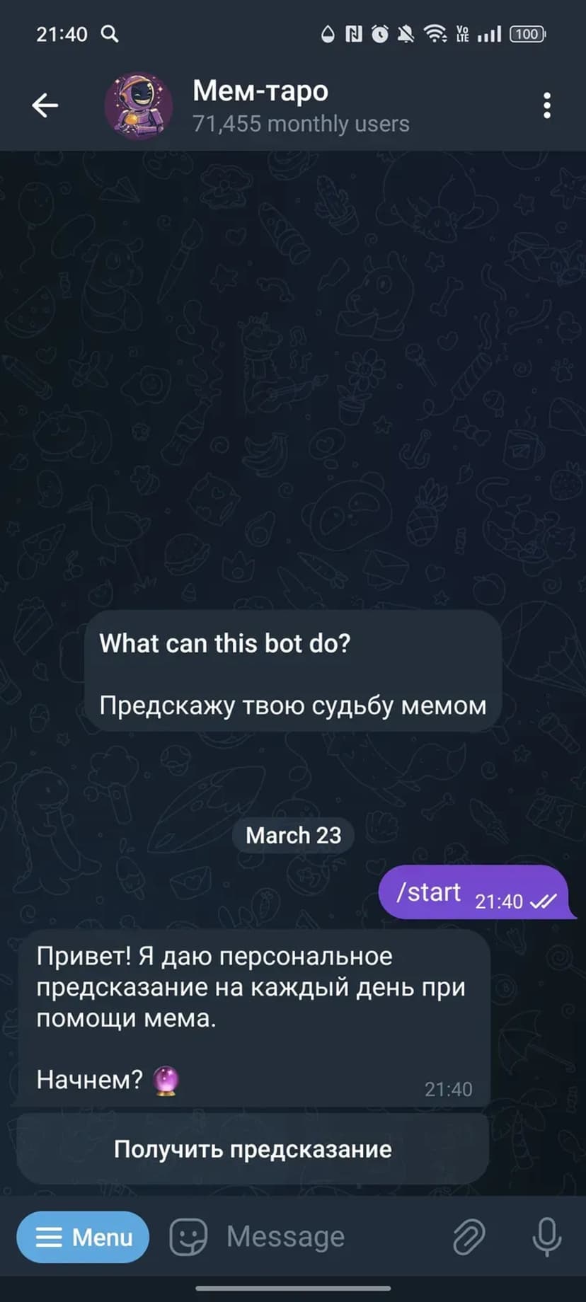 Мем-таро — мини-бот в Telegram, который присылает персональные ежедневные предсказания в виде мемов. Каждый прогноз формируется автоматически и получает свою уникальную юмористическую подачу благодаря случайному подбору изображений.