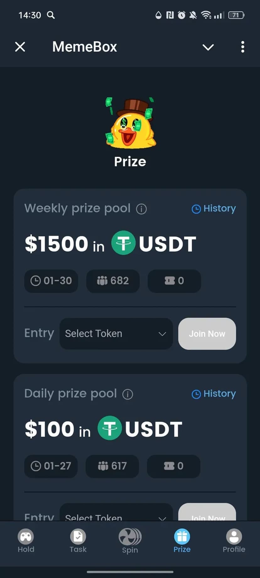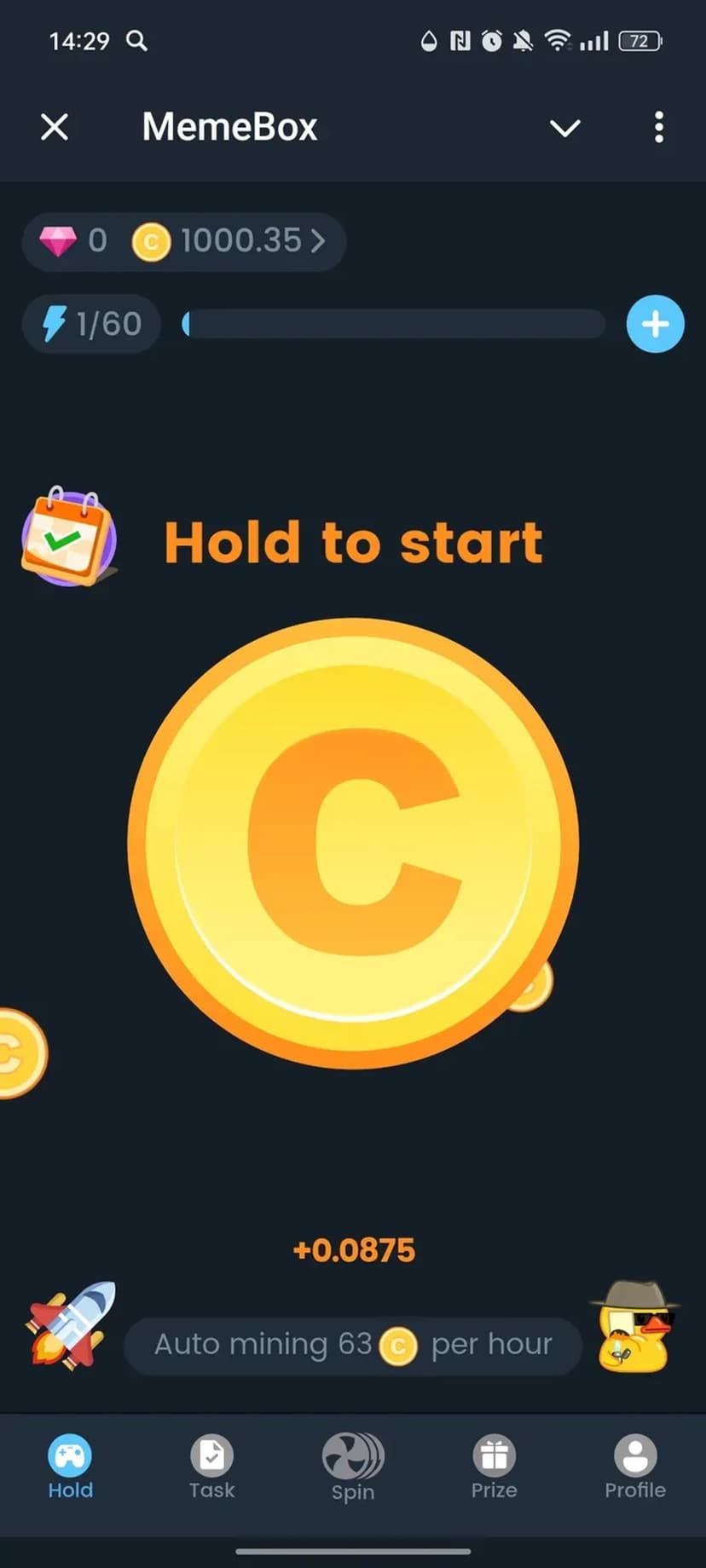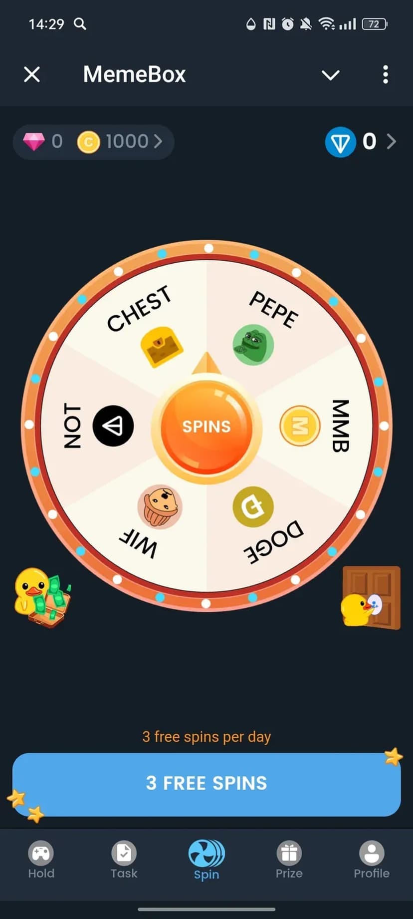 MemeBox предлагает игровые механики с возможностью заработка внутри Telegram: вращение «Колеса фортуны», участие в акции «Hold» для увеличения дохода и реферальная система для получения бонусов. Заработанные монеты и токены можно использовать для участия в дополнительных активностях или обменивать на призы.