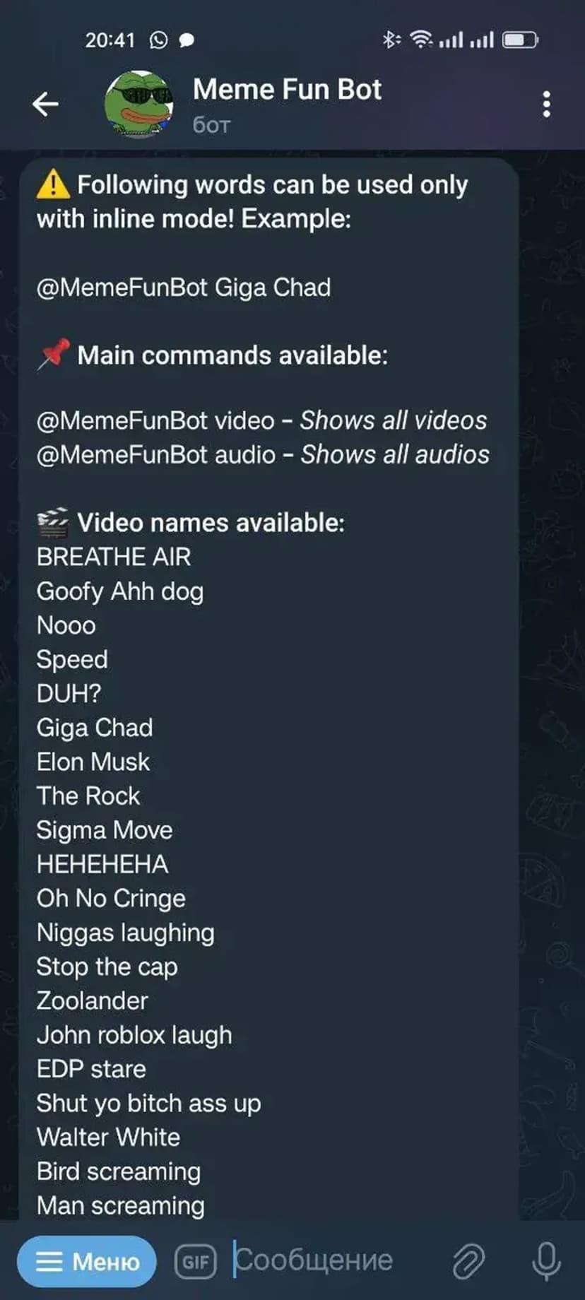 Быстро ищет и вставляет мемы в чаты, группы и каналы через inline‑режим