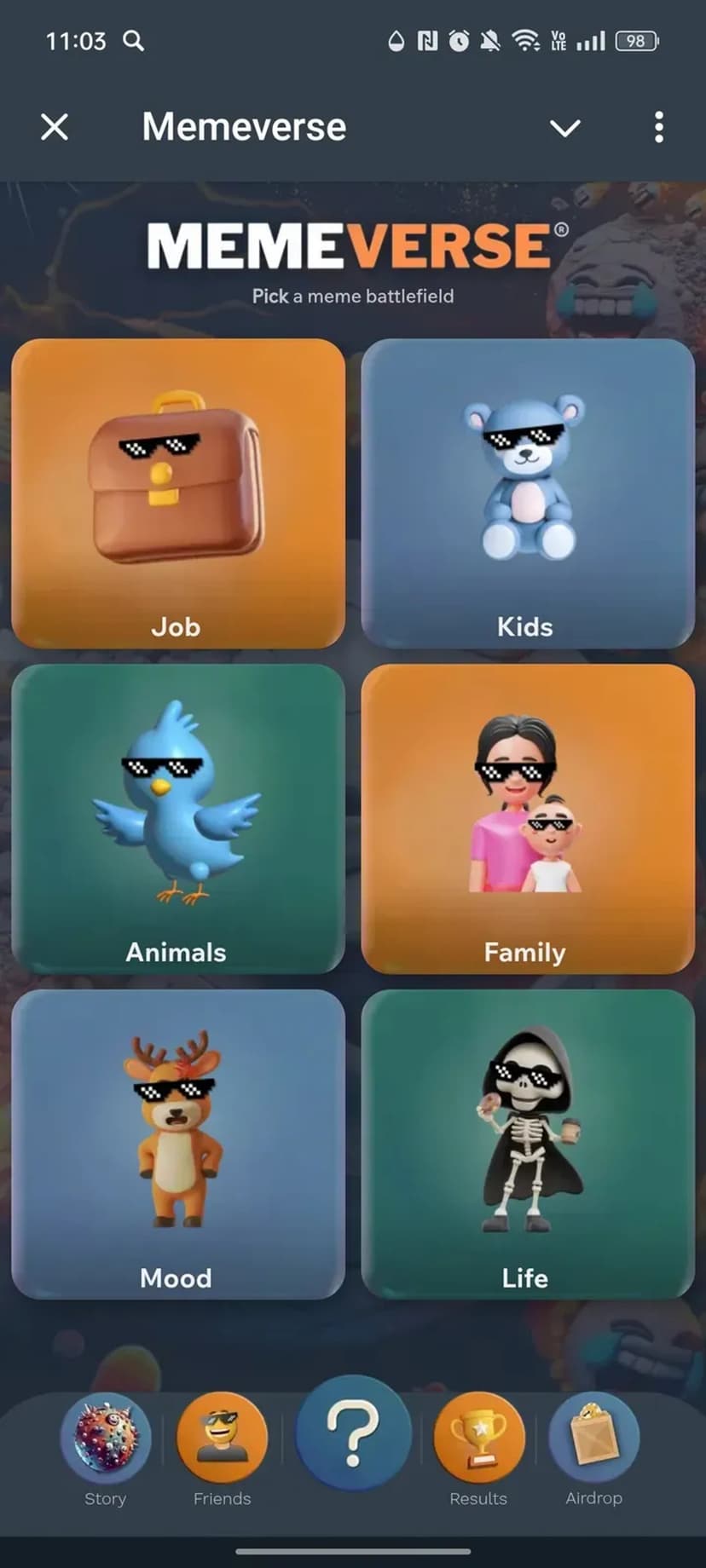 Memeverse — мини‑приложение для обмена мемами, голосований и проведения конкурсов внутри Telegram. Пользователи просматривают ленту мемов, оценивают публикации (лайк/дизлайк) и загружают медиа для участия в состязаниях.