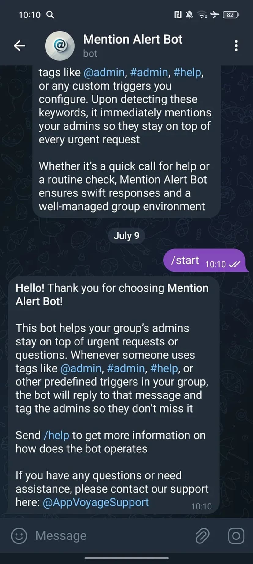 Mention Alert Bot автоматически оповещает администраторов группы при появлении сообщений с заданными ключевыми словами или тегами, помогая быстро реагировать на обращения и спорные ситуации.