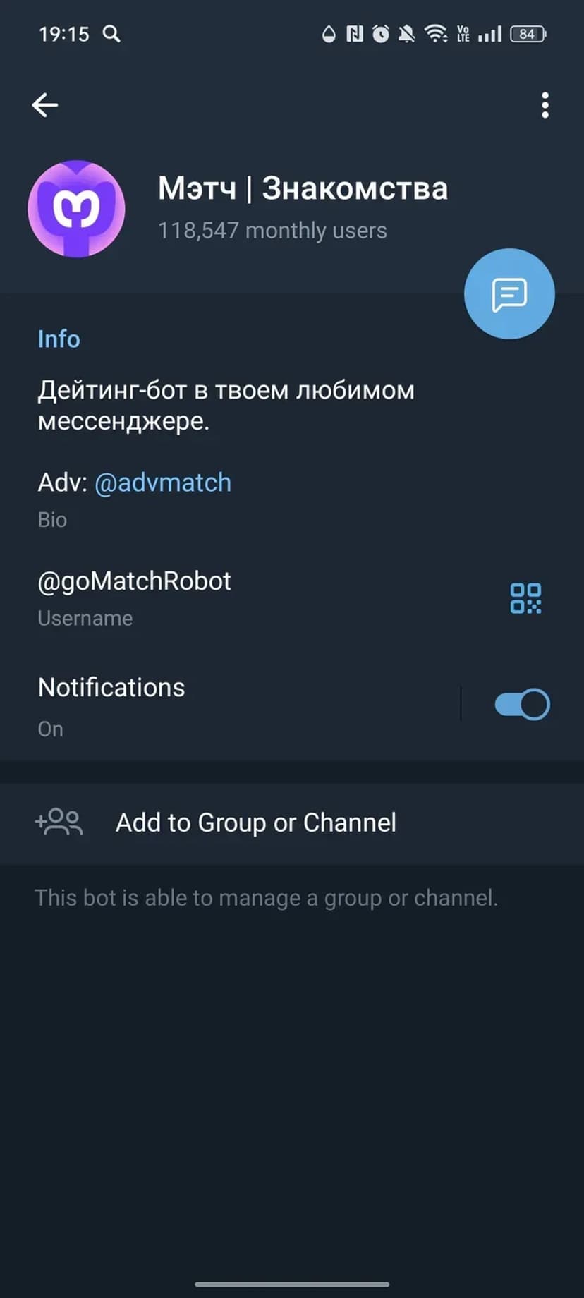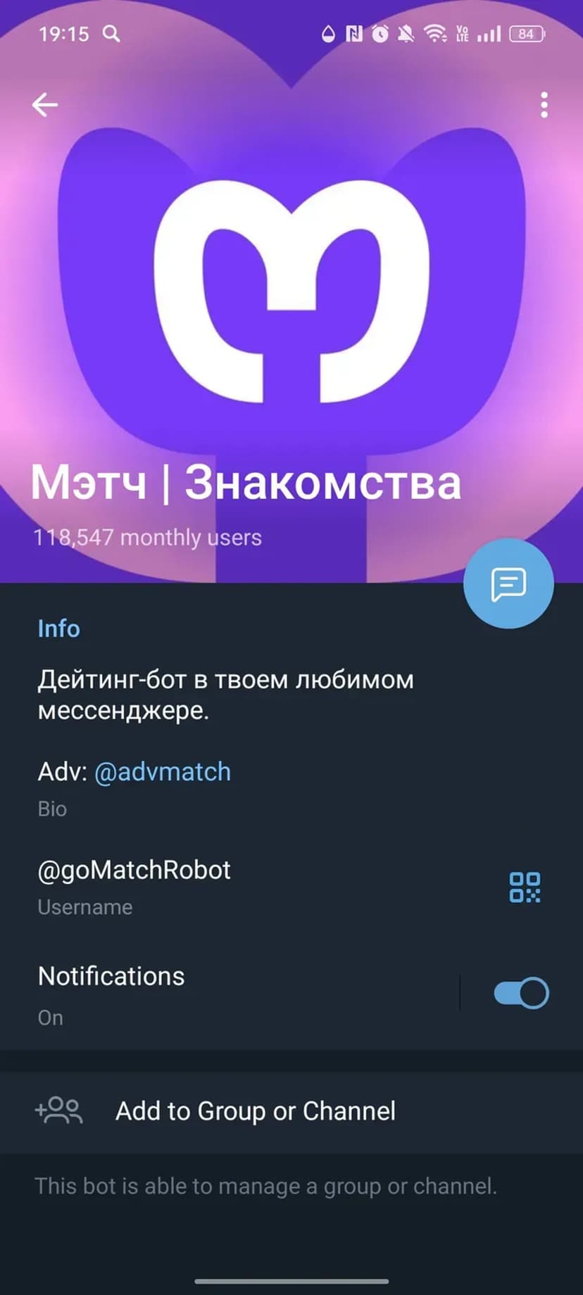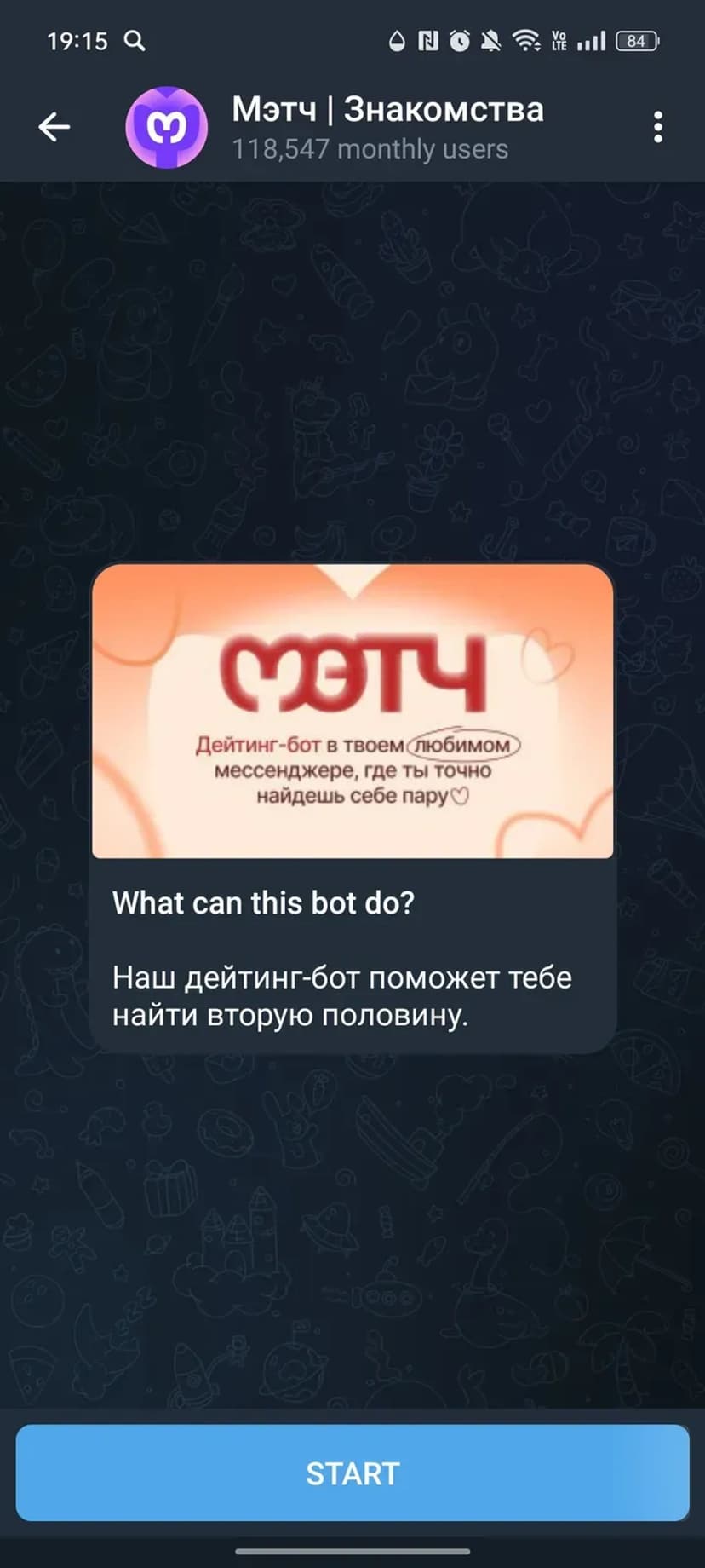 Мэтч — датинг-бот, встроенный в мессенджер, который помогает быстро находить собеседников и потенциальных партнёров без установки отдельного приложения и сложной регистрации.