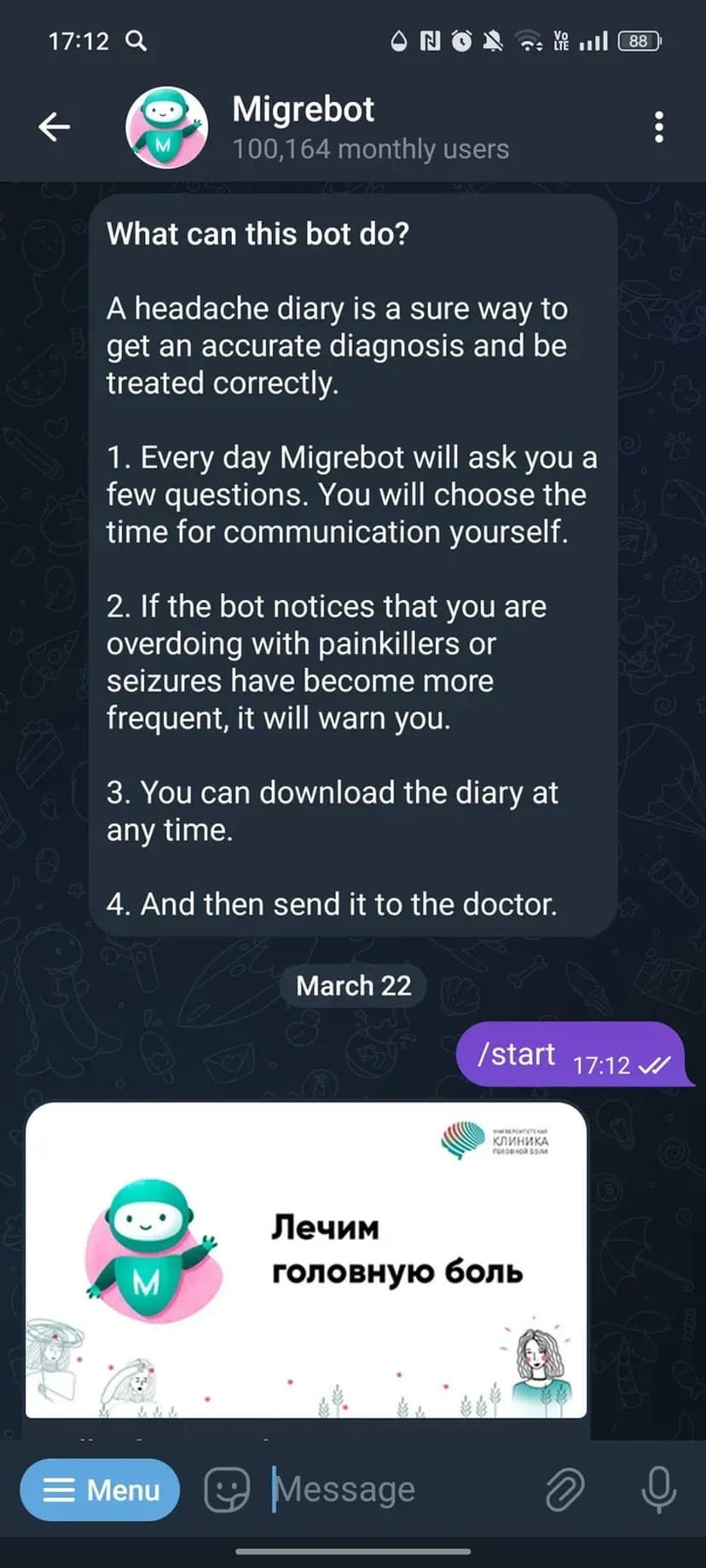 Migrebot — персональный дневник головной боли, созданный Университетской клиникой головной боли и встроенный в Telegram. Сервис предназначен для регулярного сбора сведений о приступах: их характеристиках, сопутствующих симптомах и применяемых препаратах.