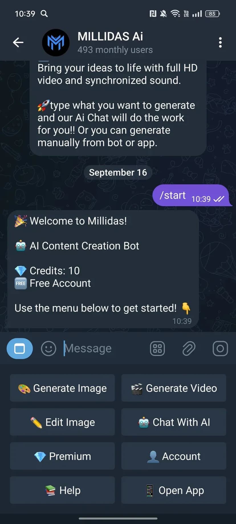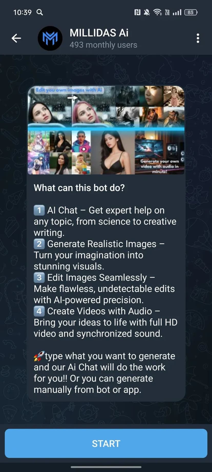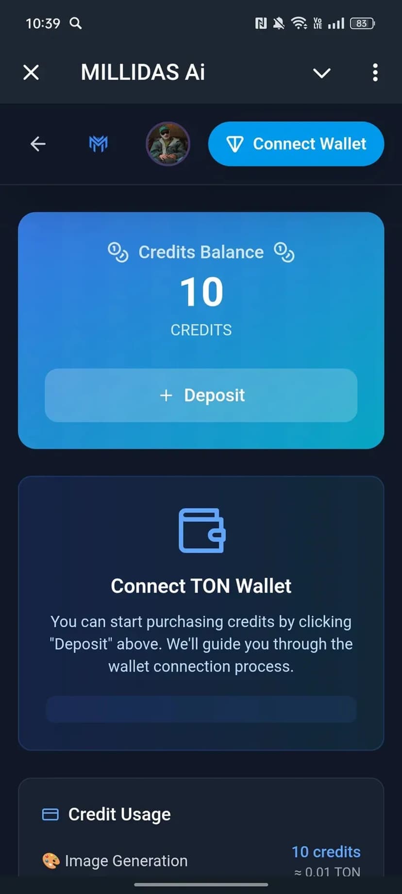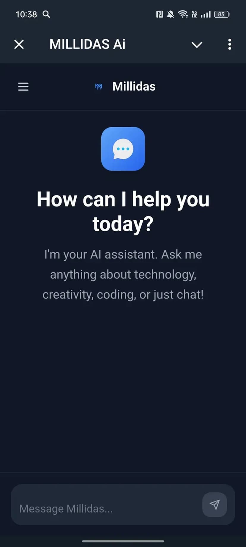 MILLIDAS Ai предоставляет быстрый доступ к возможностям искусственного интеллекта прямо в чате Telegram. Сервис помогает получать текстовые ответы, формировать идеи и готовить краткие сводки по запросам пользователя.