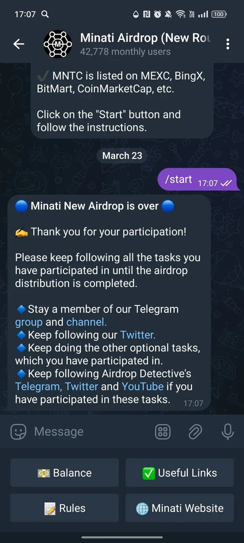 Minati Airdrop (New Round) — мини‑бот для участия в распределении токенов: авторизация через Telegram, список актуальных заданий и начисления на внутренний счёт после подтверждения выполнения.