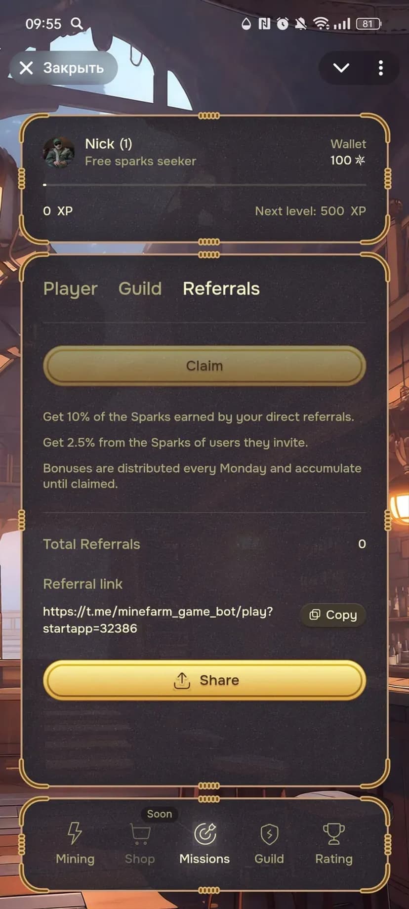 *Нажимая "Открыть в Telegram", вы перейдете к приложению Minefarm в мессенджере Telegram