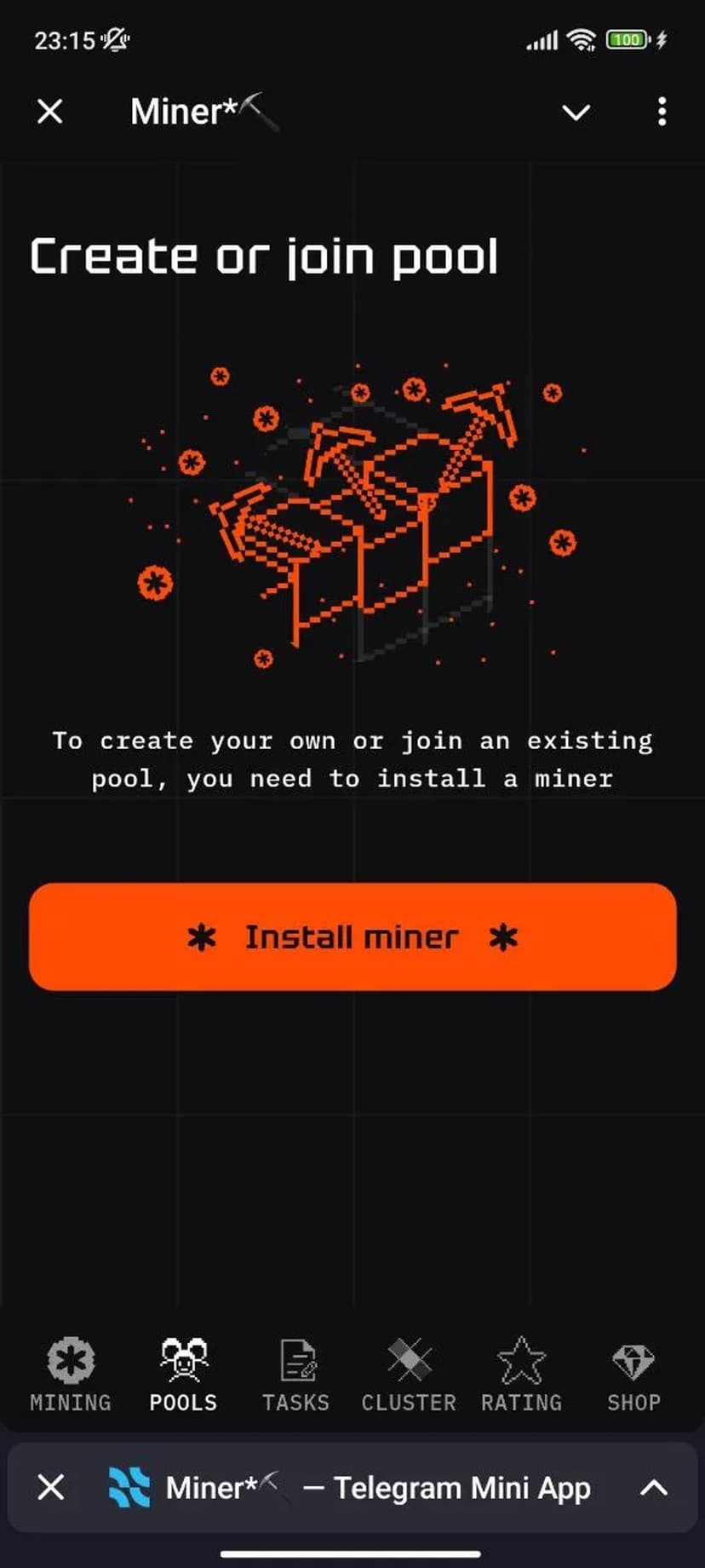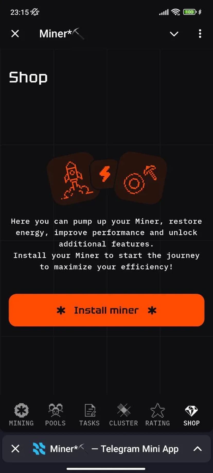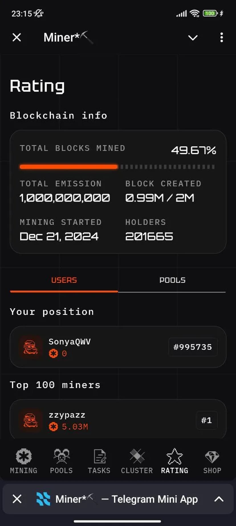 Miner — игра в Telegram, где за вознаграждение добывают токены, решая головоломки, имитирующие процесс майнинга. Задачи выполняются с использованием вычислительной мощности мобильных устройств; сложность адаптируется под число игроков, чтобы поддерживать стабильную скорость добычи.