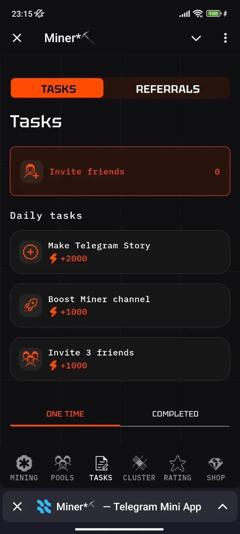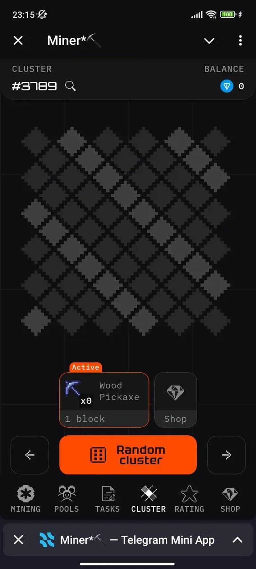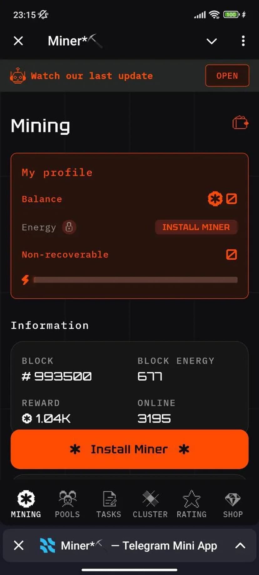 Miner — игра в Telegram, где за вознаграждение добывают токены, решая головоломки, имитирующие процесс майнинга. Задачи выполняются с использованием вычислительной мощности мобильных устройств; сложность адаптируется под число игроков, чтобы поддерживать стабильную скорость добычи.