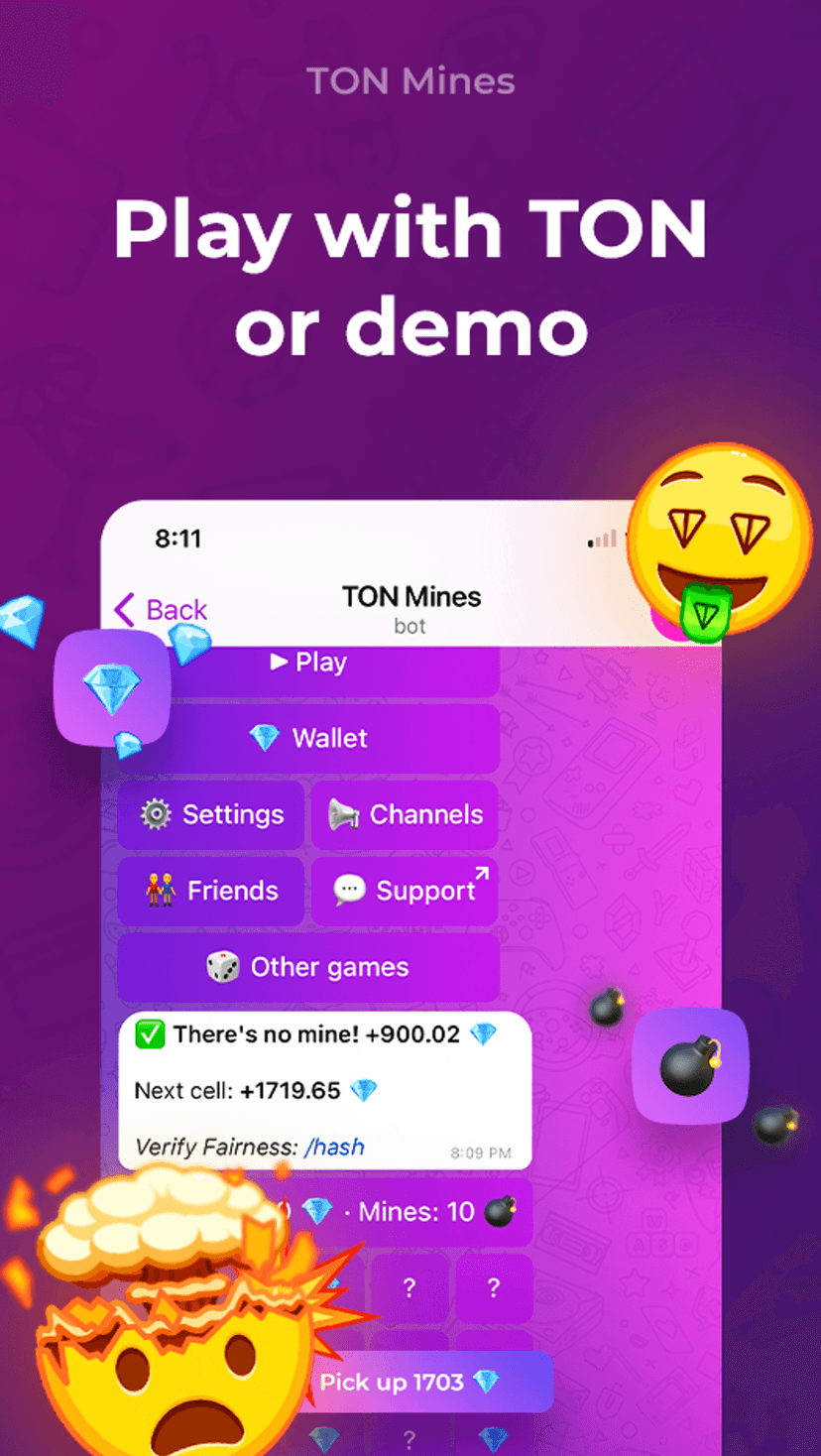Mines — классическая игра на минном поле с возможностью ставок в Toncoin и отдельным демо‑режимом для проверки механики без риска.