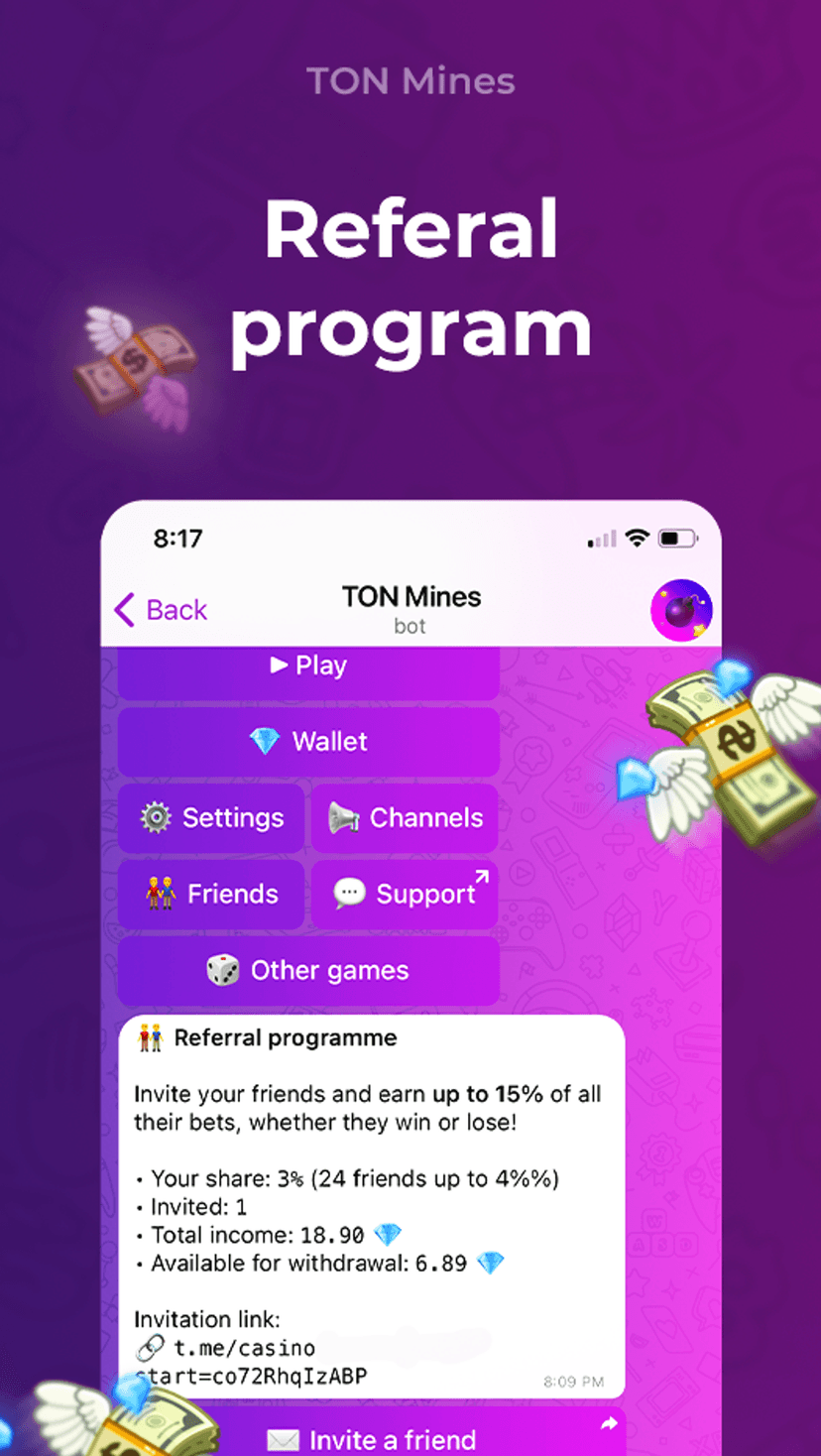 - Выплаты и партнёрство: быстрые выплаты в Toncoin; встроенная партнёрская программа даёт до 15% от ставок приглашённых.