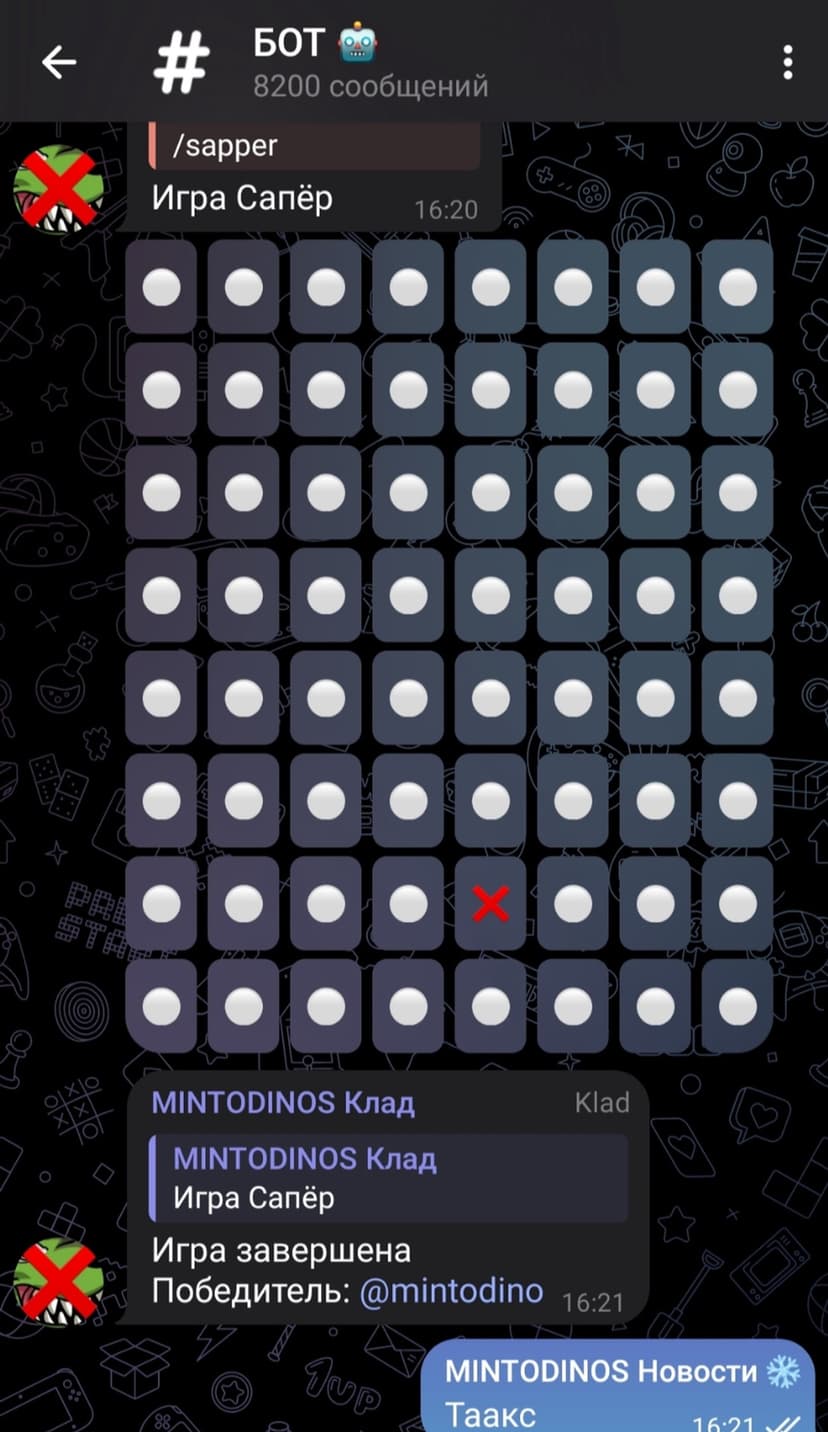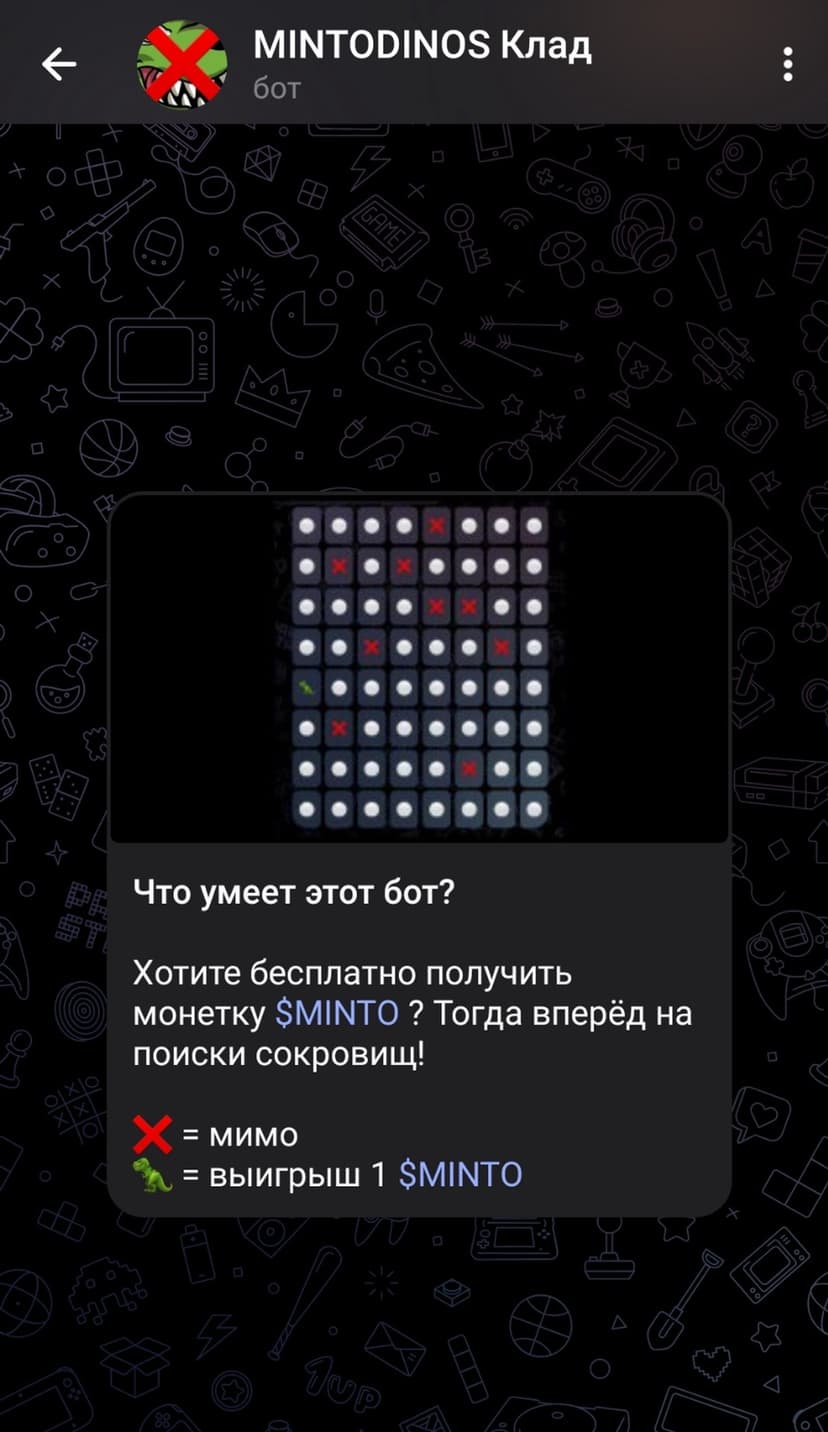 MINTODINOS Treasure — ежедневная мини‑игра в Telegram. Раз в сутки вы выбираете одну ячейку на игровом поле, напоминающем классический сапёр; если под ней окажется динозавр 🦖, вы получаете внутриигровой жетон.