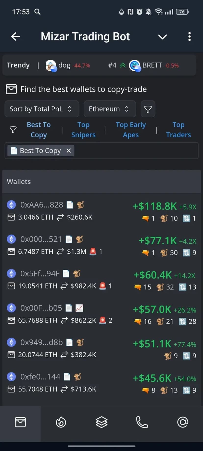Mizar Trading Bot объединяет on-chain аналитику и автоматическое копирование сделок в одном Telegram-интерфейсе — быстрые сигналы и мониторинг активности на сетях Ethereum, Base, BNB Chain и Solana.