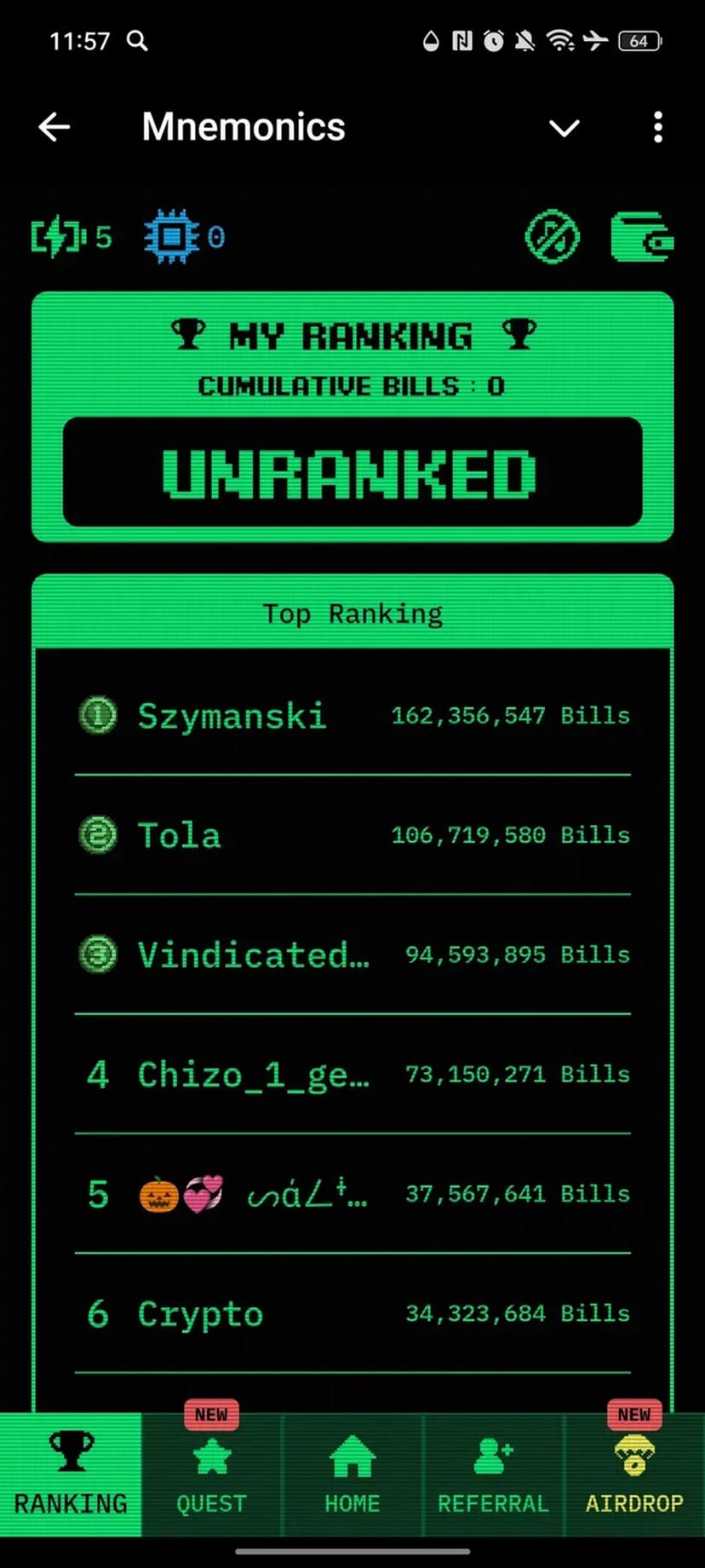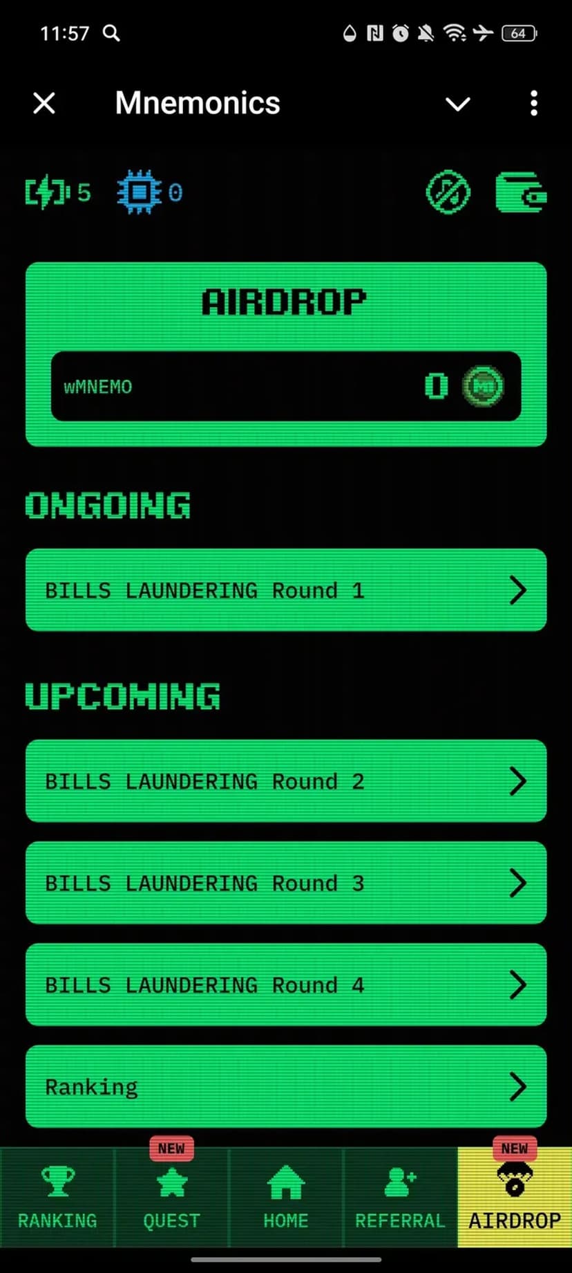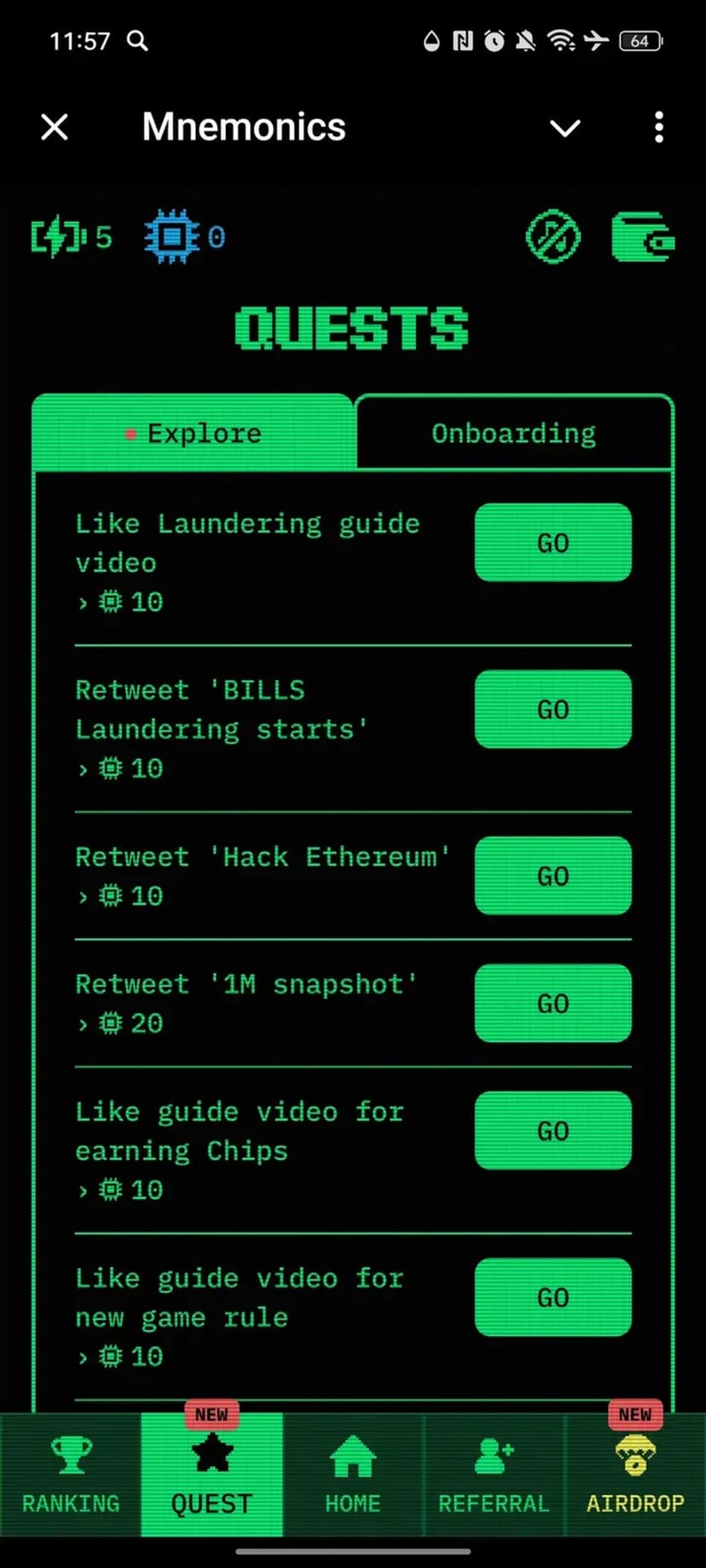 Mnemonics — телеграм-бот в формате play-to-earn, совмещающий элементы расшифровки и симуляции «взлома» криптокошельков. Игроки выполняют игровые задания, получают внутриигровые монеты и имеют возможность участвовать в аирдропах.
