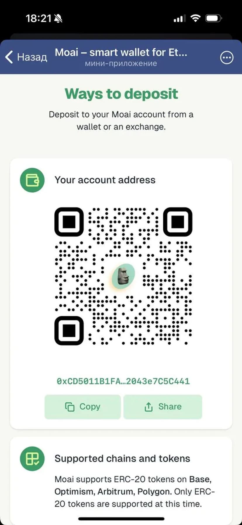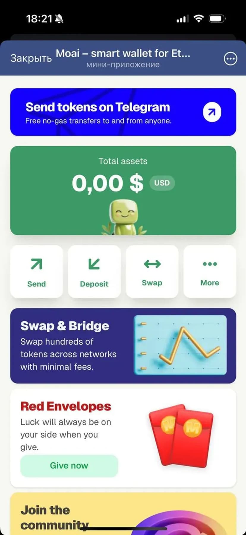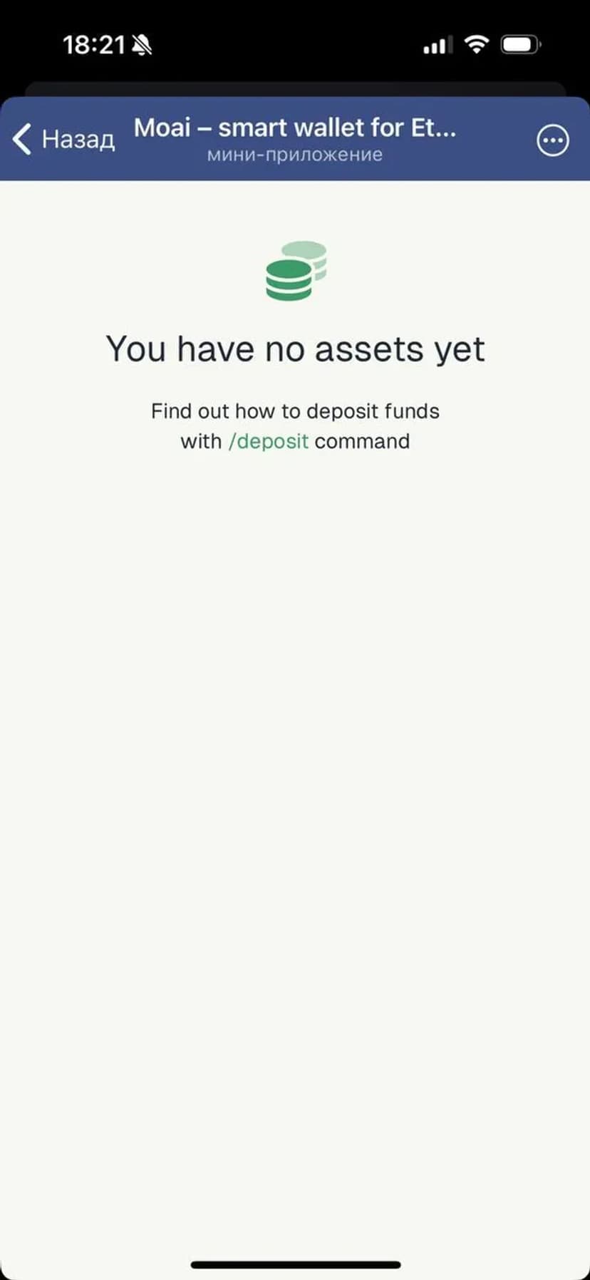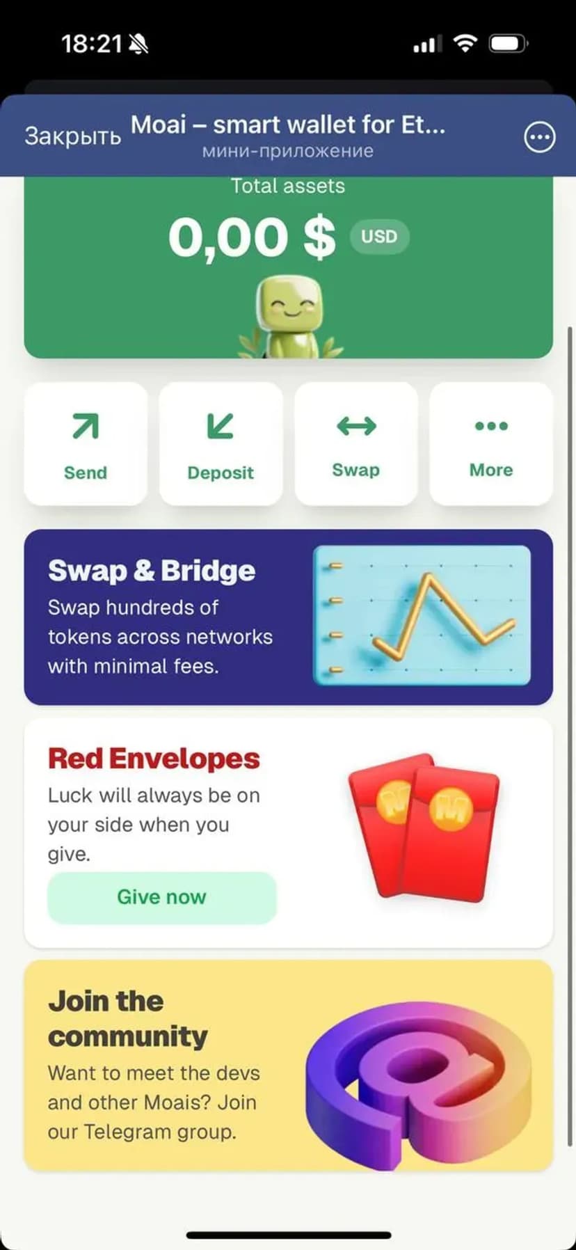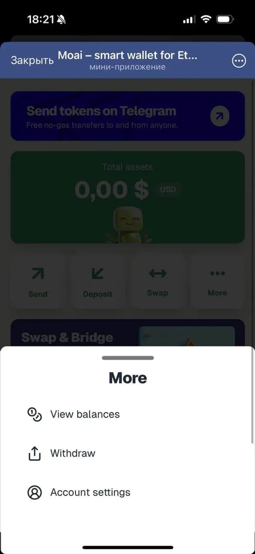 *Нажимая "Открыть в Telegram", вы перейдете к приложению Moai Smart Wallet в мессенджере Telegram