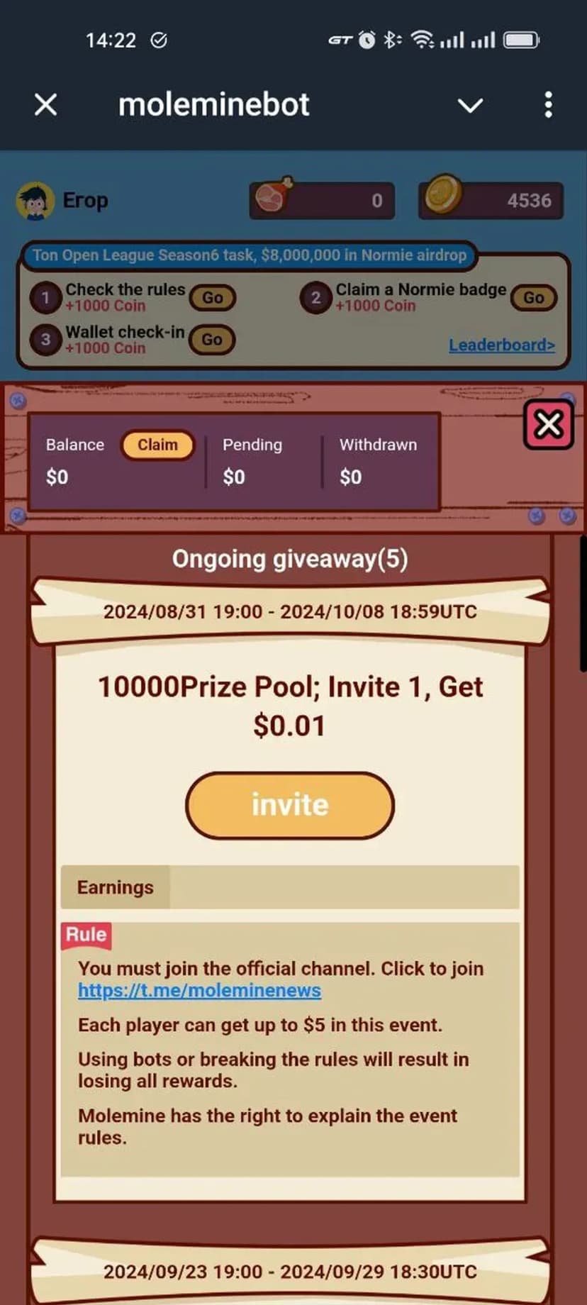 Вход проходит через Telegram-аккаунт без дополнительной регистрации: не требуется e-mail или паспорт. Новым игрокам начисляется фиксированный стартовый бонус $0.5, а за каждого приглашённого пользователя действует вознаграждение $0.01.