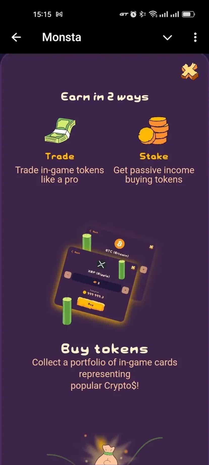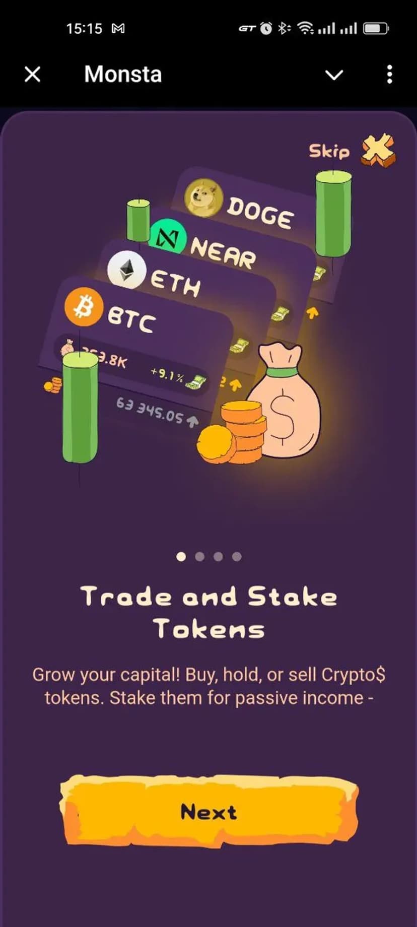 Monsta — экономическая игра с элементами криптовалютного трейдинга, где игроки могут зарабатывать реальные вознаграждения через торговлю внутриигровыми активами и механики стейкинга.
