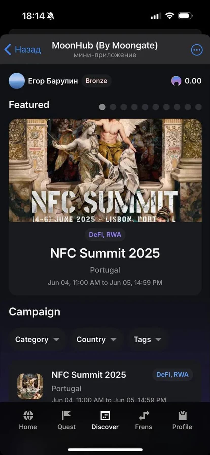 MoonHub объединяет поиск событий, регистрацию и покупку билетов прямо в Telegram, добавляя социальные функции и элементы геймификации для активных участников офлайн‑ и онлайн‑ивентов, включая Web3‑мероприятия.