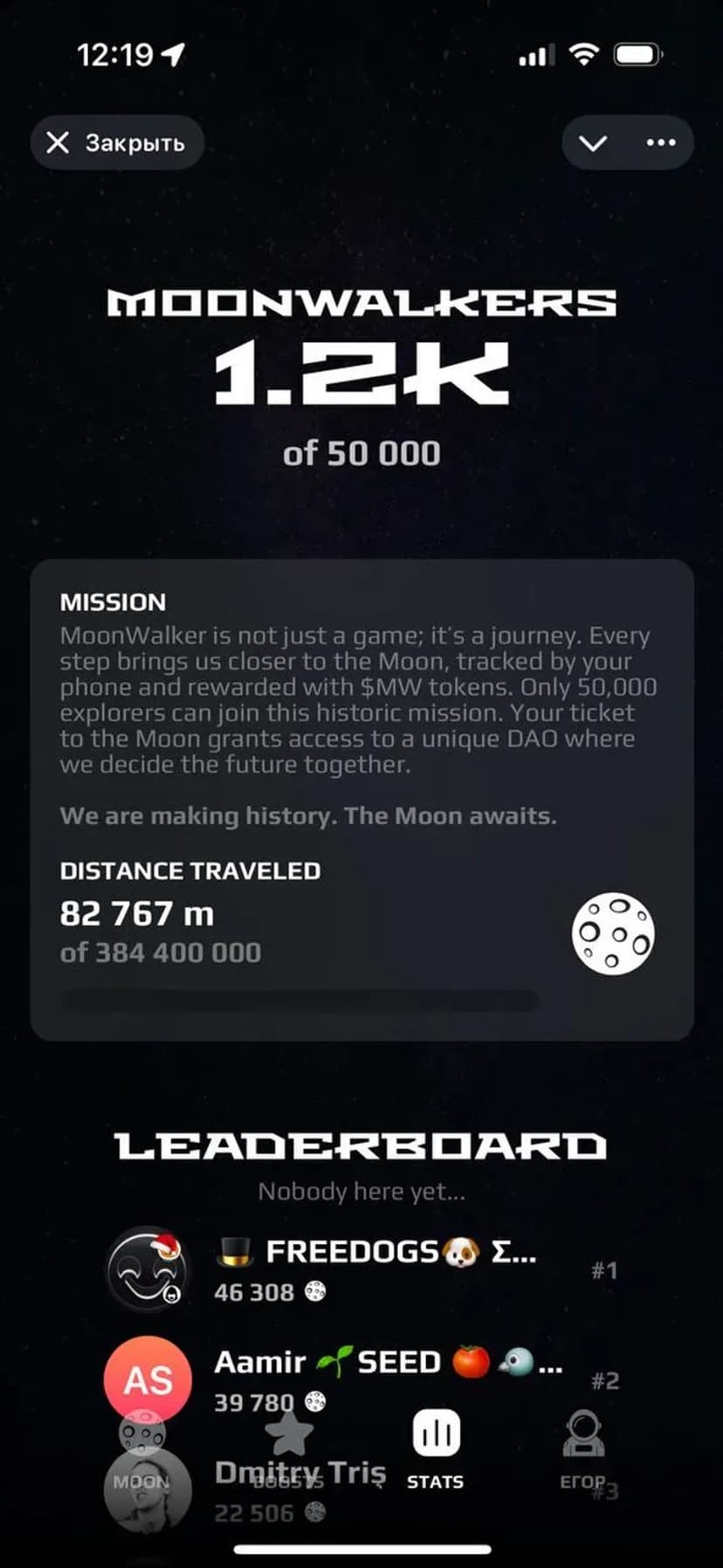 Зарабатывайте $MW за каждый метр с GPS — вместе пройти 384 400 000 м до Луны.