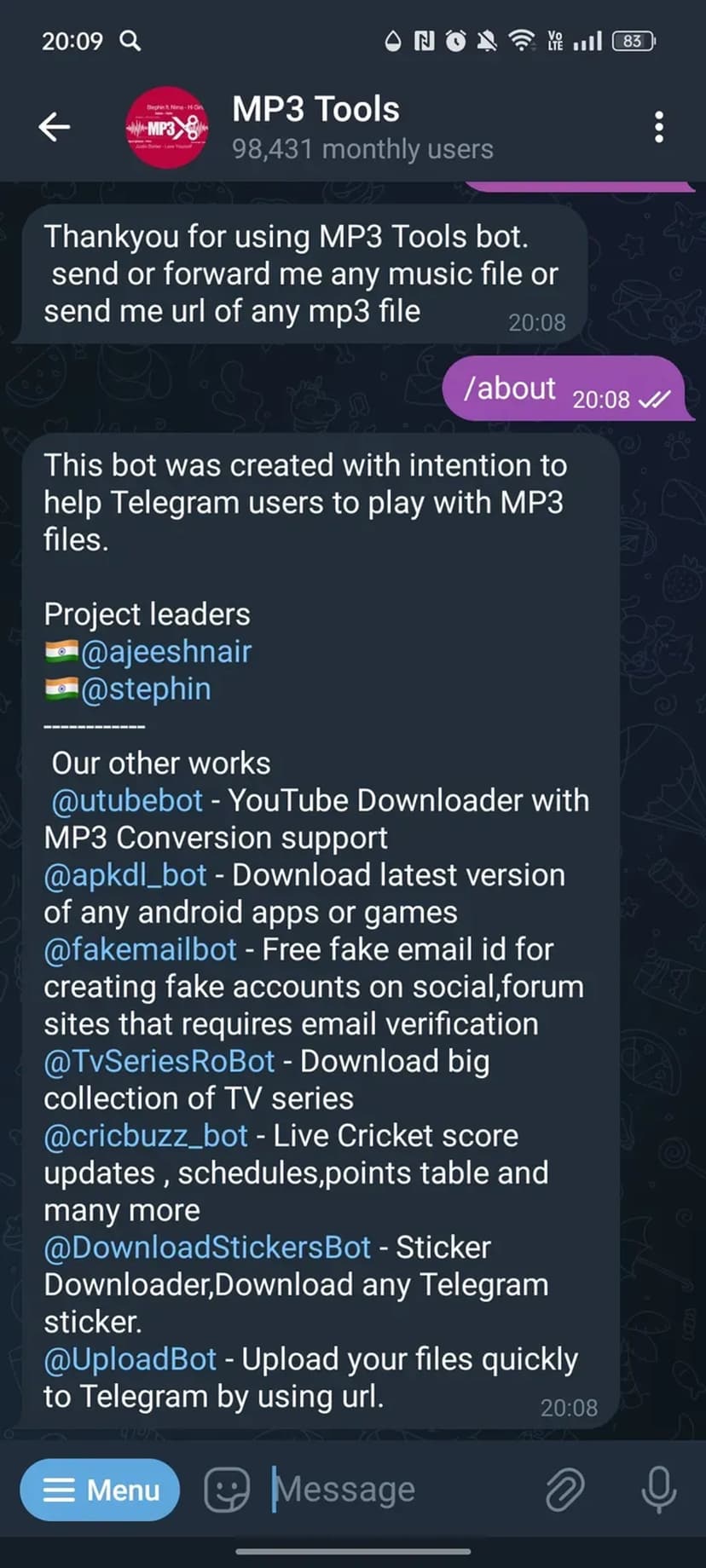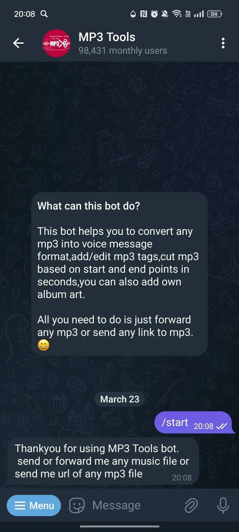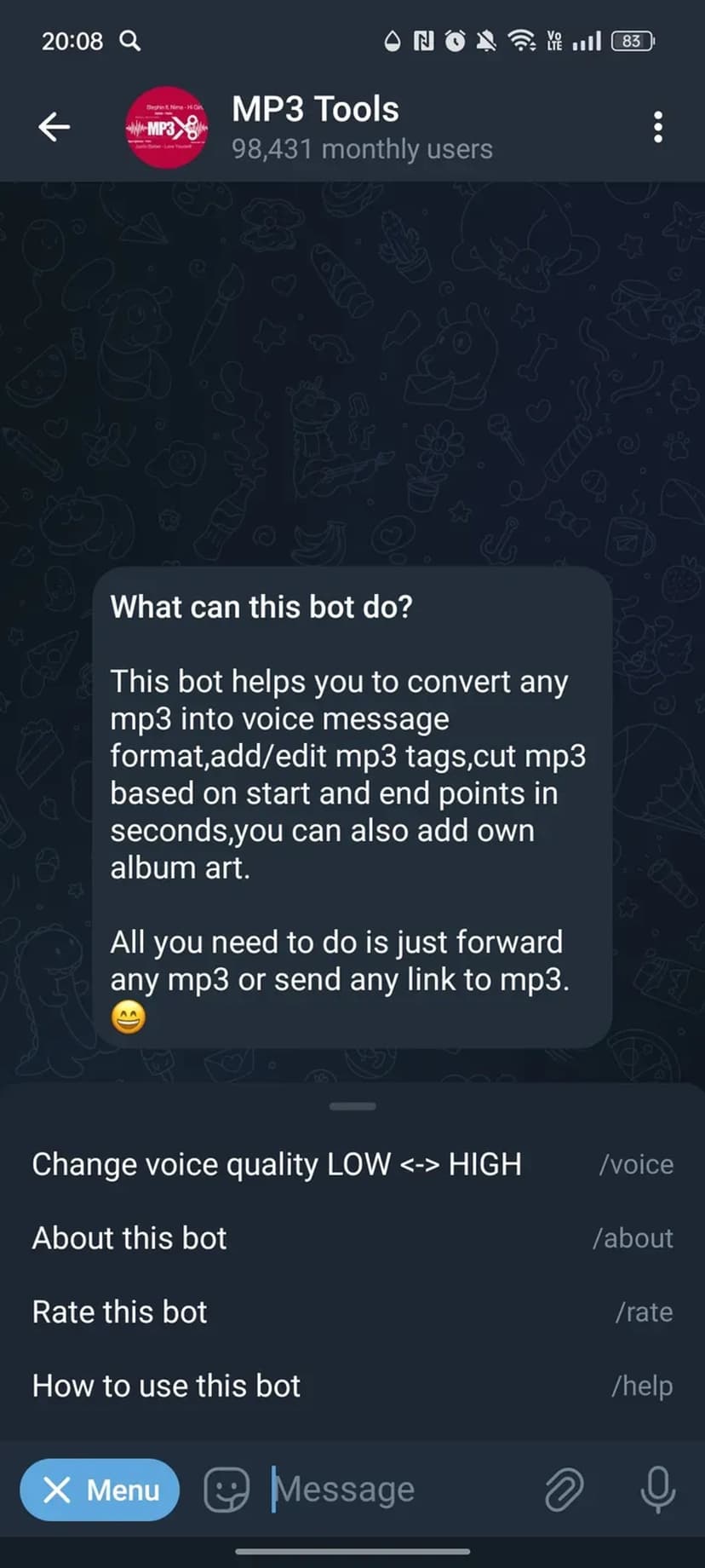 MP3 Tools позволяет быстро обрабатывать MP3-файлы прямо в мессенджере: конвертировать в голосовые сообщения, менять метаданные, вырезать фрагменты и добавлять обложку.