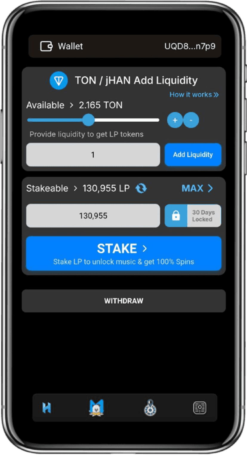 Пример использования: пользователь подключает криптокошелёк, стейкает LP-токены, выбирает K-POP-трек и запускает стрим. За активность начисляются HAN, а участие в Spin-играх может увеличить получаемые вознаграждения.