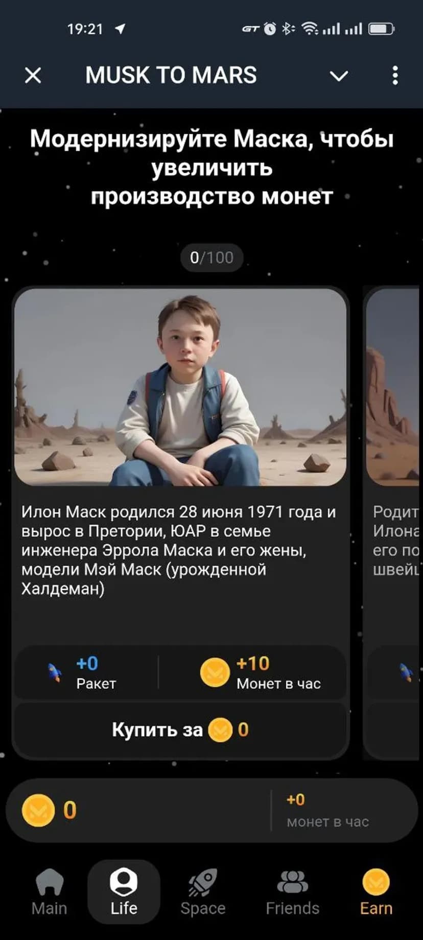 MUSK TO MARS — мини‑игра, объединяющая элементы кликера и квизов. Игроки получают MUSK-монеты и ракеты за выполнение ежедневных заданий, прохождение викторин по биографии Илона Маска и приглашение друзей.