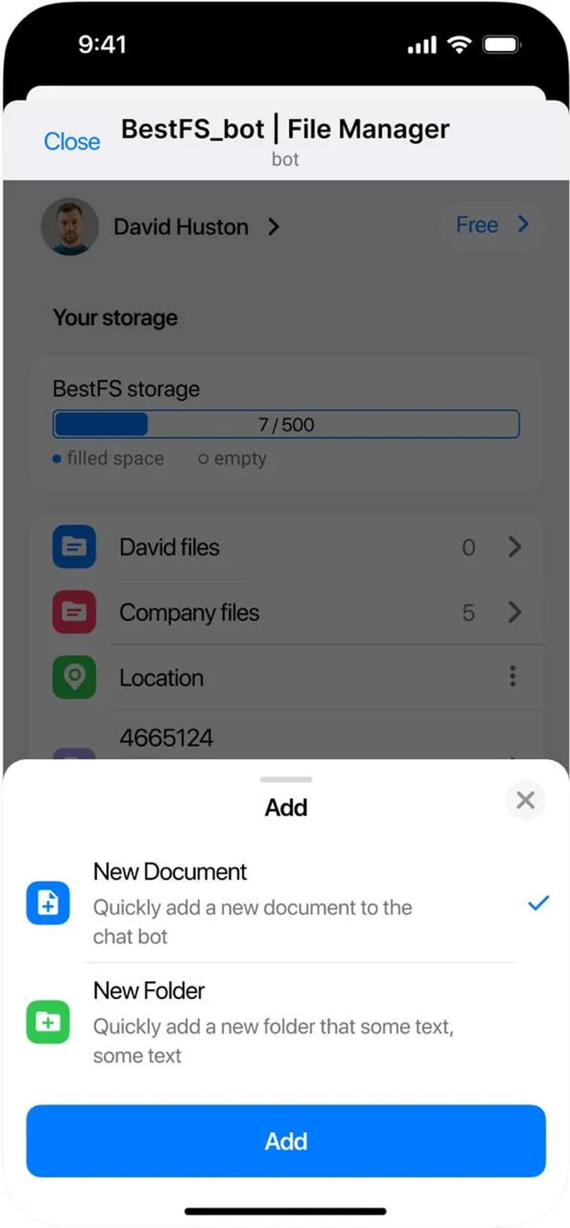 MyDocs предлагает простой способ оцифровать, организовать и анализировать документы внутри Telegram. Пользователь сразу видит список файлов и папок, может загрузить документ или отсканировать бумажную копию через камеру, а навигация выполнена с использованием стандартных кнопок мессенджера.