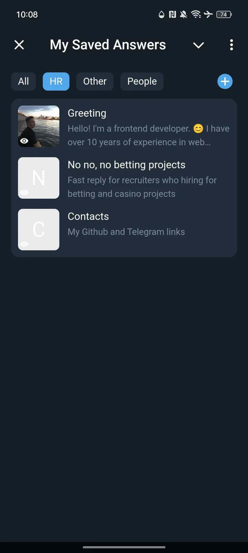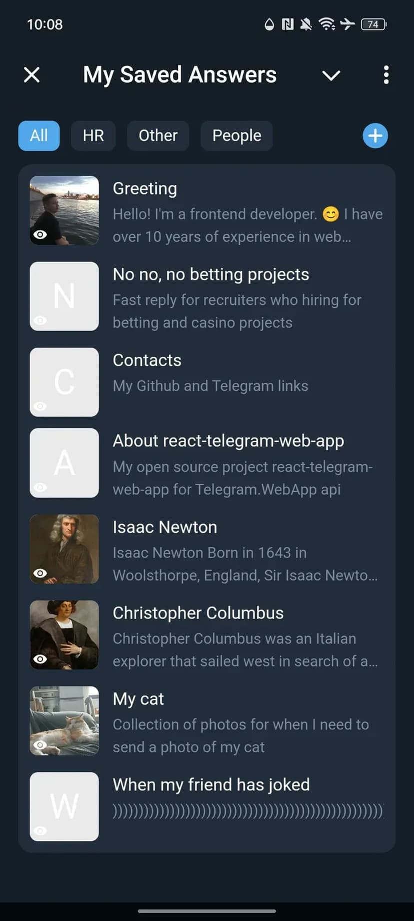 My Saved Answers позволяет хранить подготовленные текстовые ответы и отправлять их в диалоги за пару кликов. Шаблоны сохраняются в личной библиотеке и становятся доступными прямо в интерфейсе мини‑приложения.