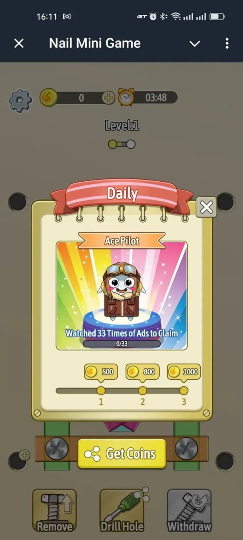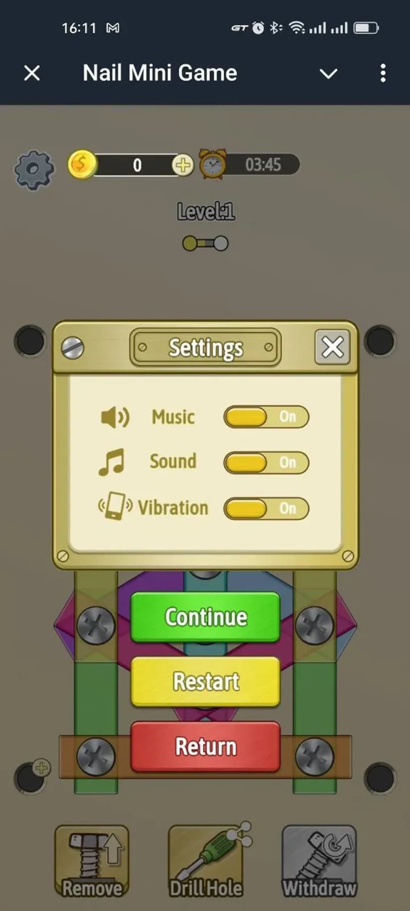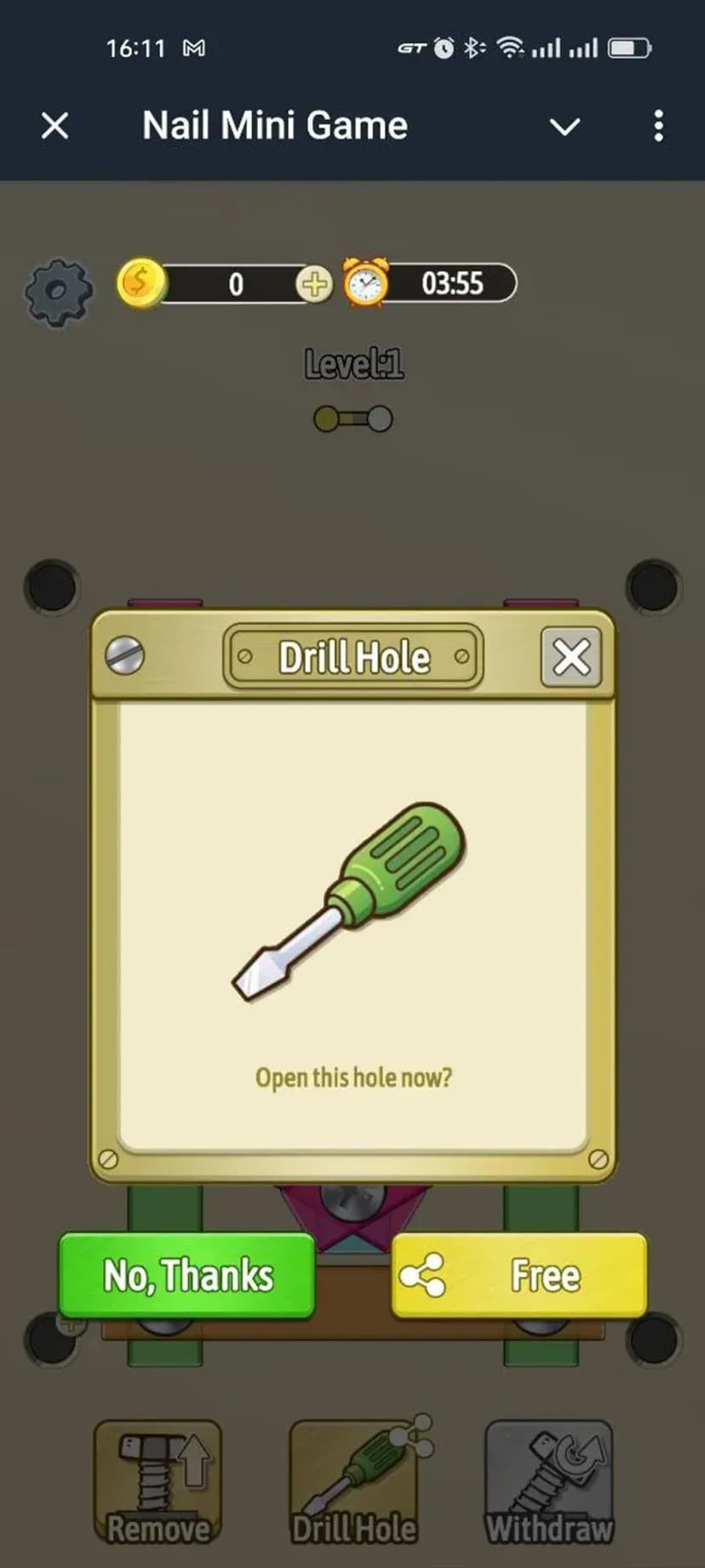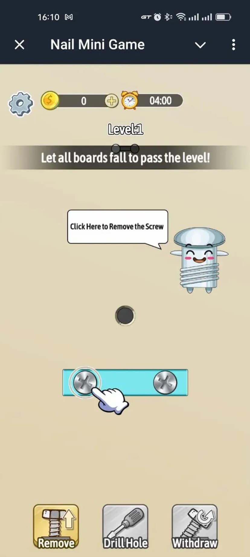 Nail Mini Game — казуальная мини-игра с реалистичной симуляцией закручивания и откручивания винтов. Игра ориентирована на быстрые сессии и тренирует моторную ловкость и координацию движений.