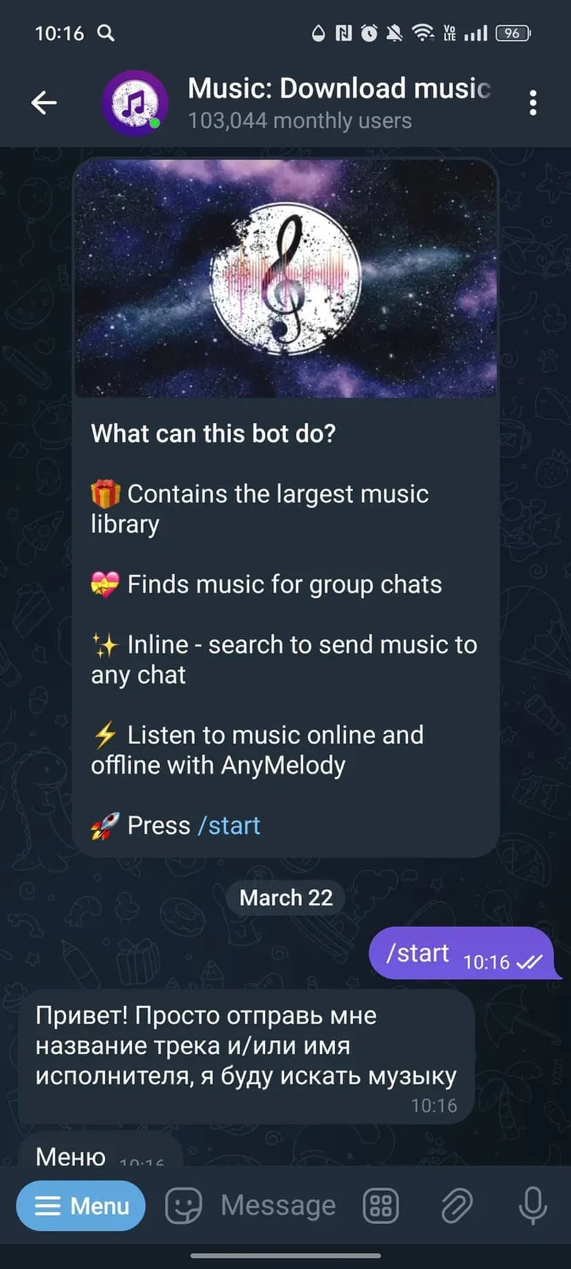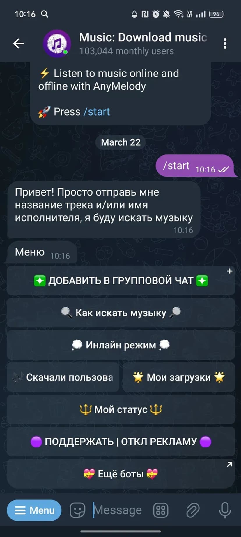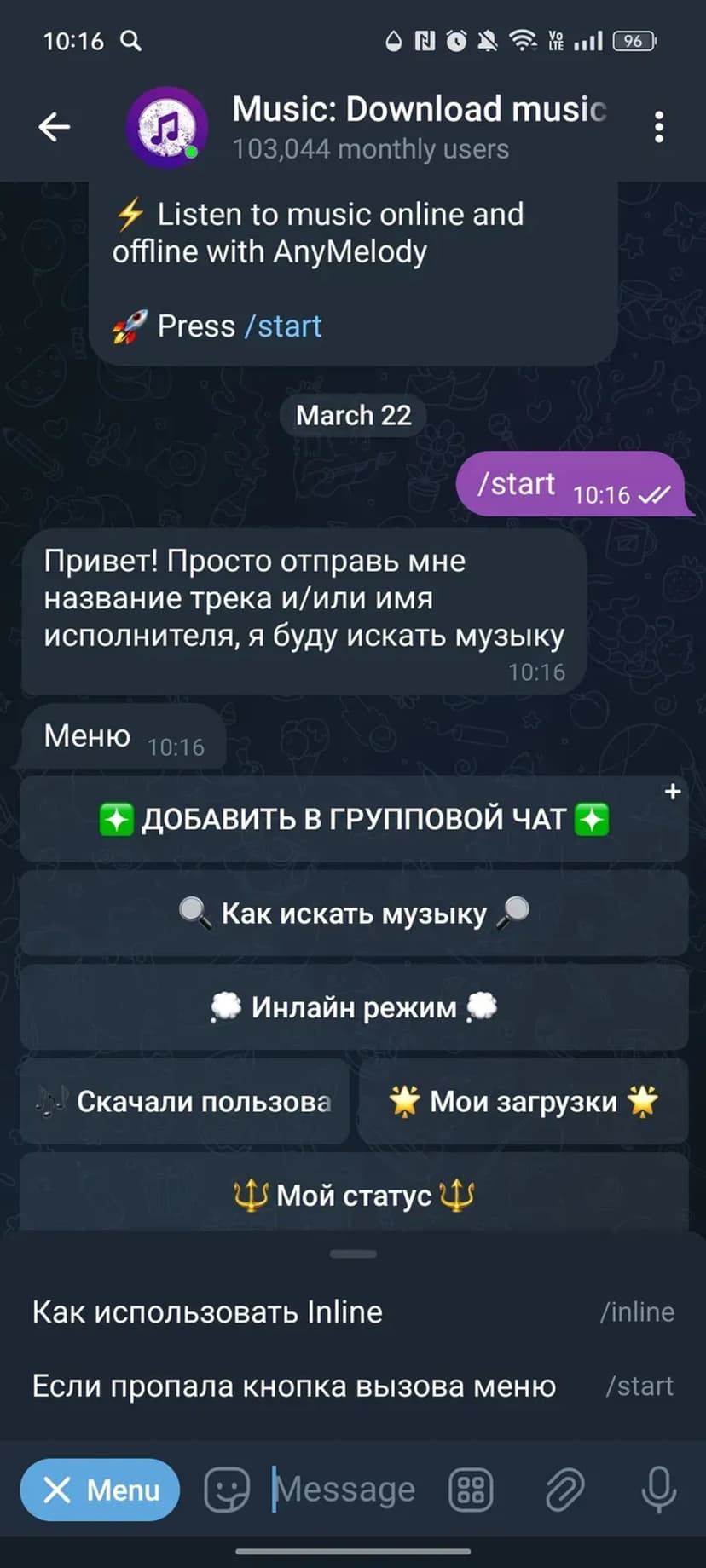 Быстрый поиск музыки в Энимелоди — отправьте запрос по названию или исполнителю прямо в чат и получите ссылки для прослушивания и скачивания.
