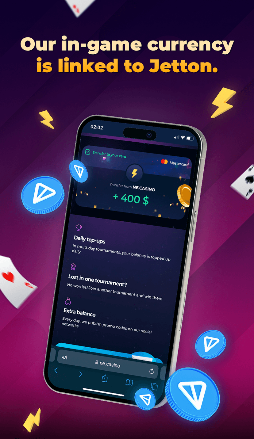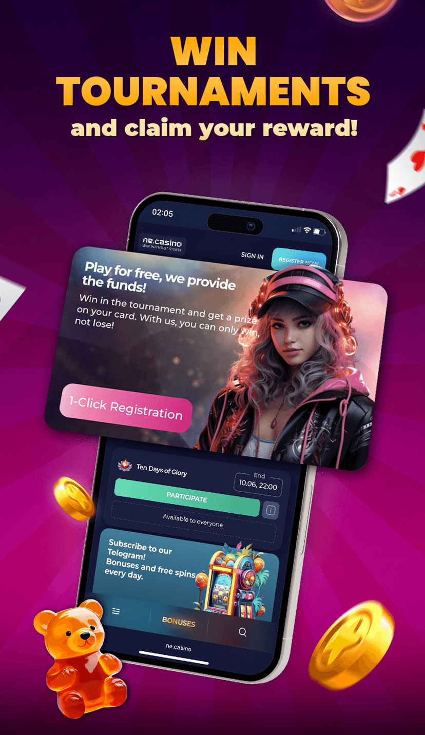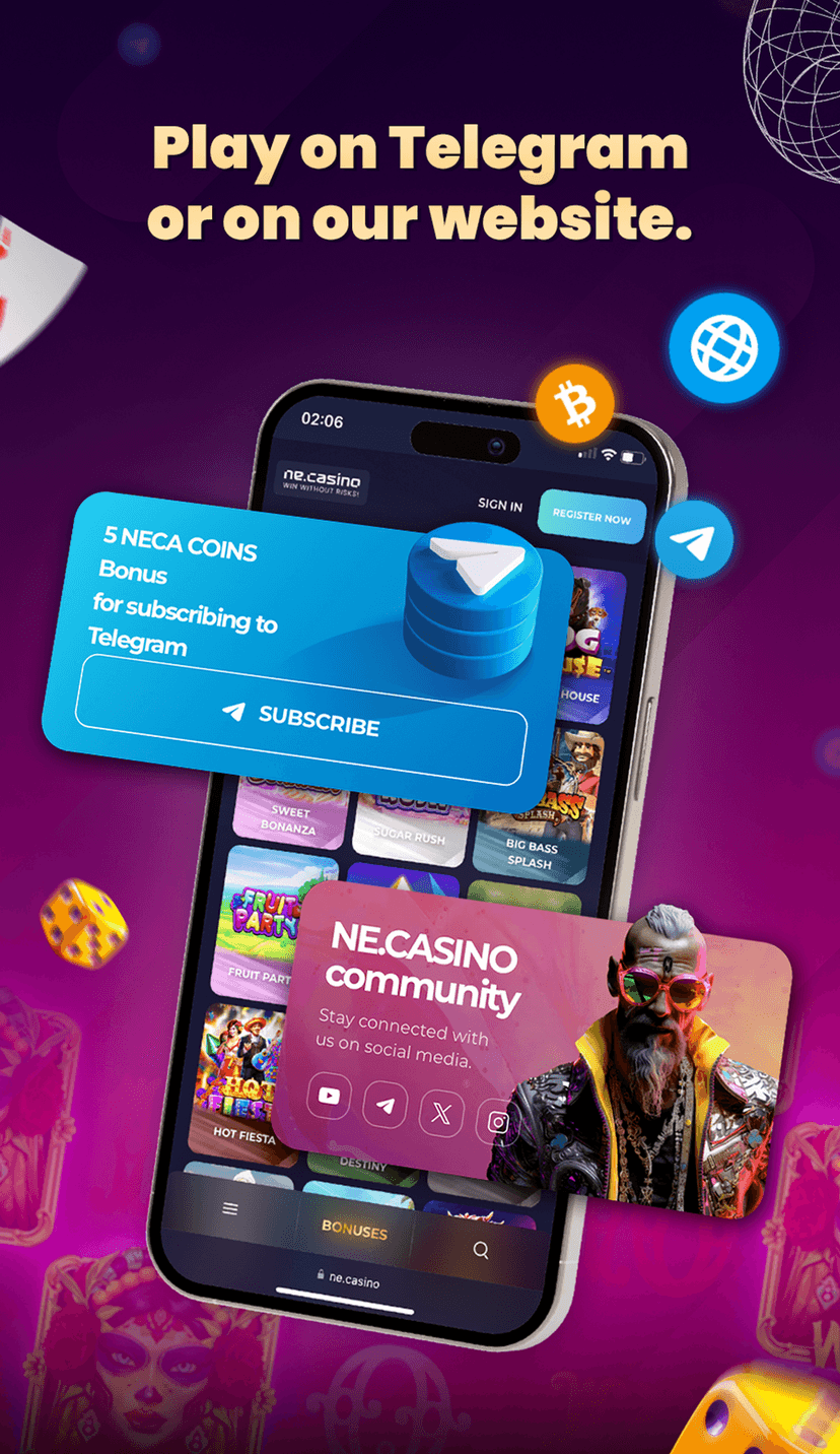 NE.CASINO — игровой сервис внутри Telegram, сочетающий классические слот-машины с элементами геймификации и соревновательности. Все игровые активности проходят без ставок на реальные деньги.