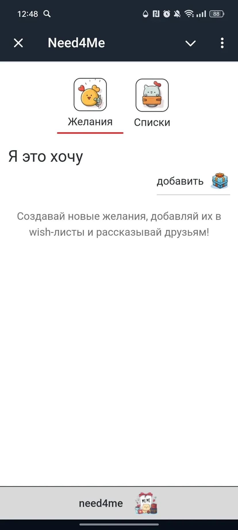 Need4Me позволяет формировать и хранить вишлисты для любых событий: дни рождения, Новый год, годовщины и другие. В каждом списке удобно добавлять желаемые подарки с описанием, ссылкой на товар и фотографией, а затем отправлять список знакомым прямо в Telegram.