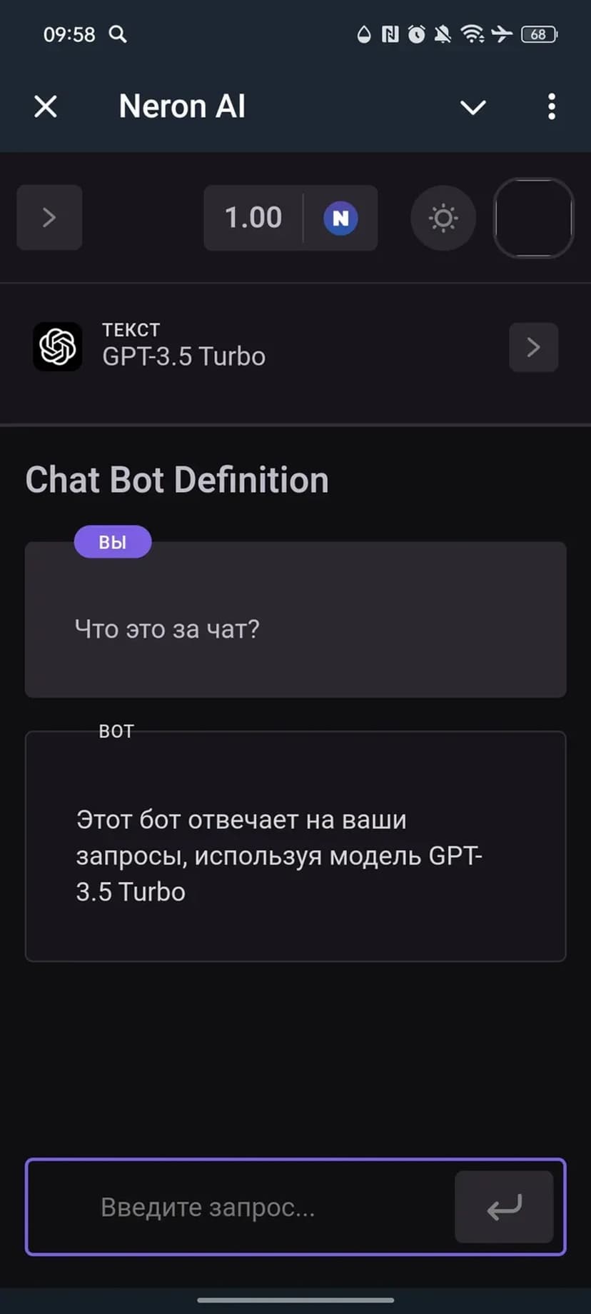 Neron AI предоставляет доступ к универсальному искусственному интеллекту для диалога, генерации идей и получения быстрых ответов. Сервис работает в Telegram и также доступен на Web, iOS и Android, обеспечивая кроссплатформенный доступ с любого устройства.