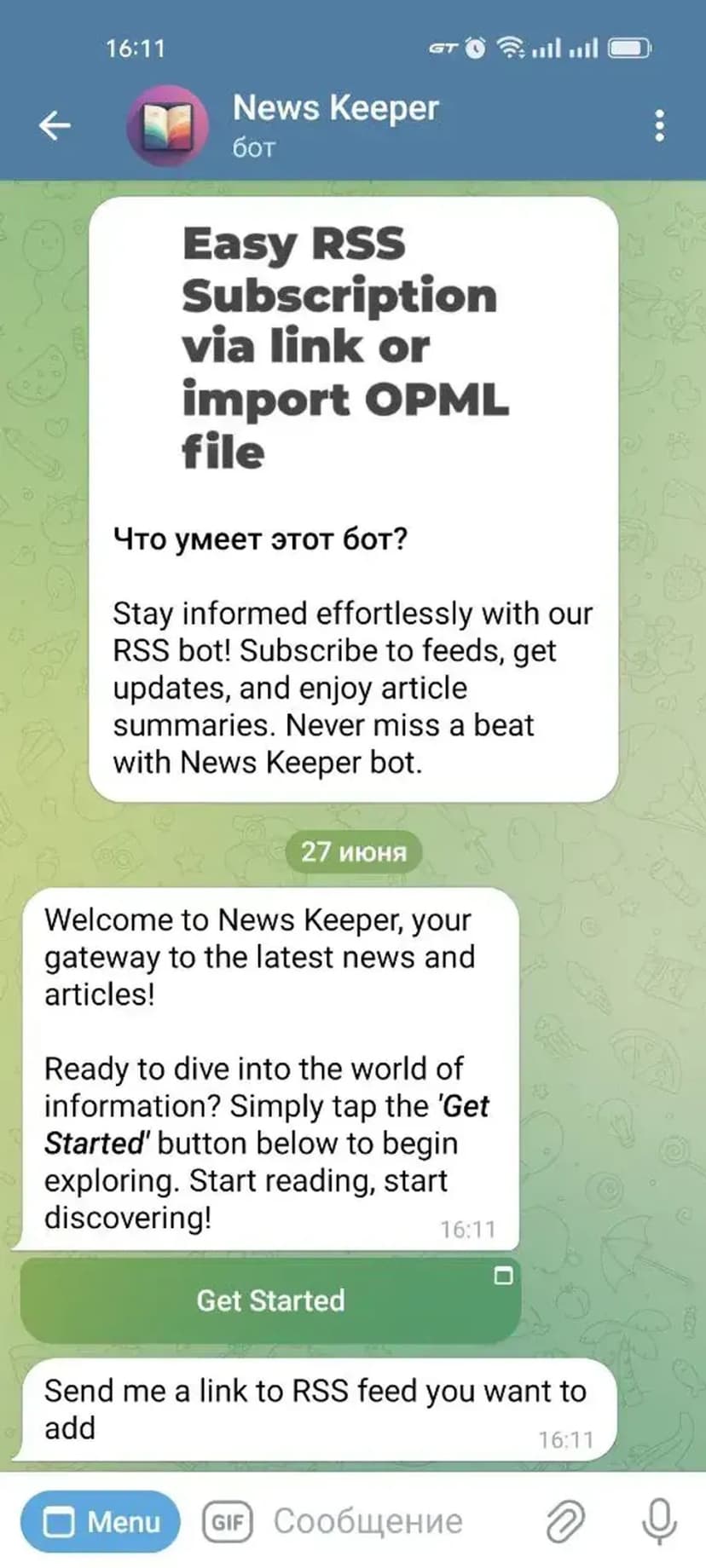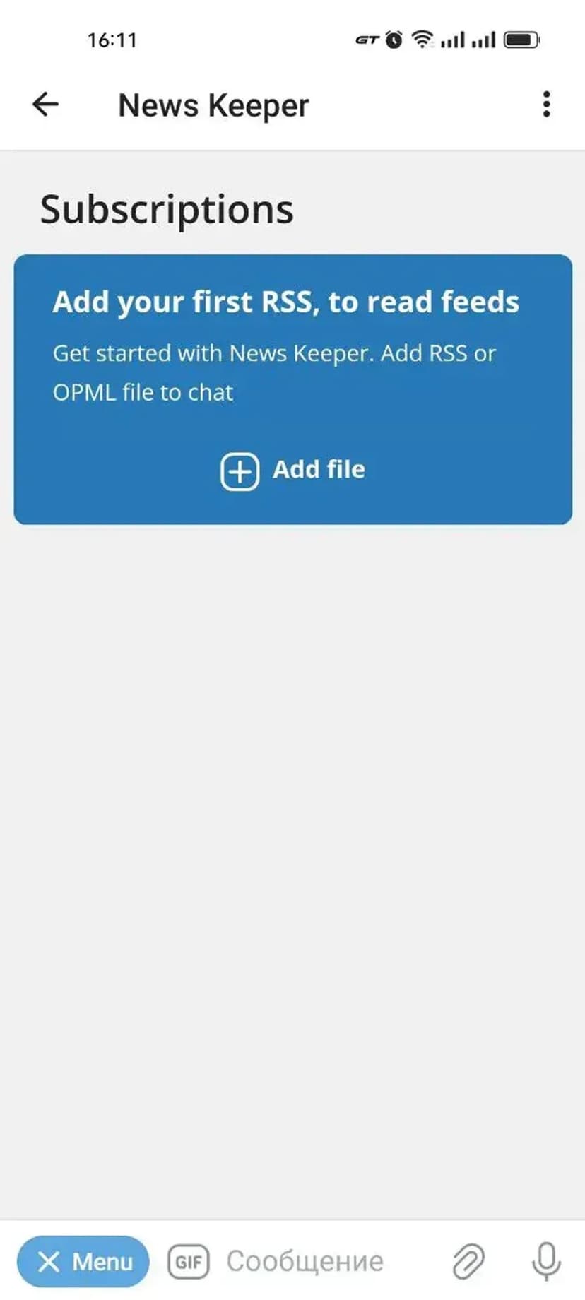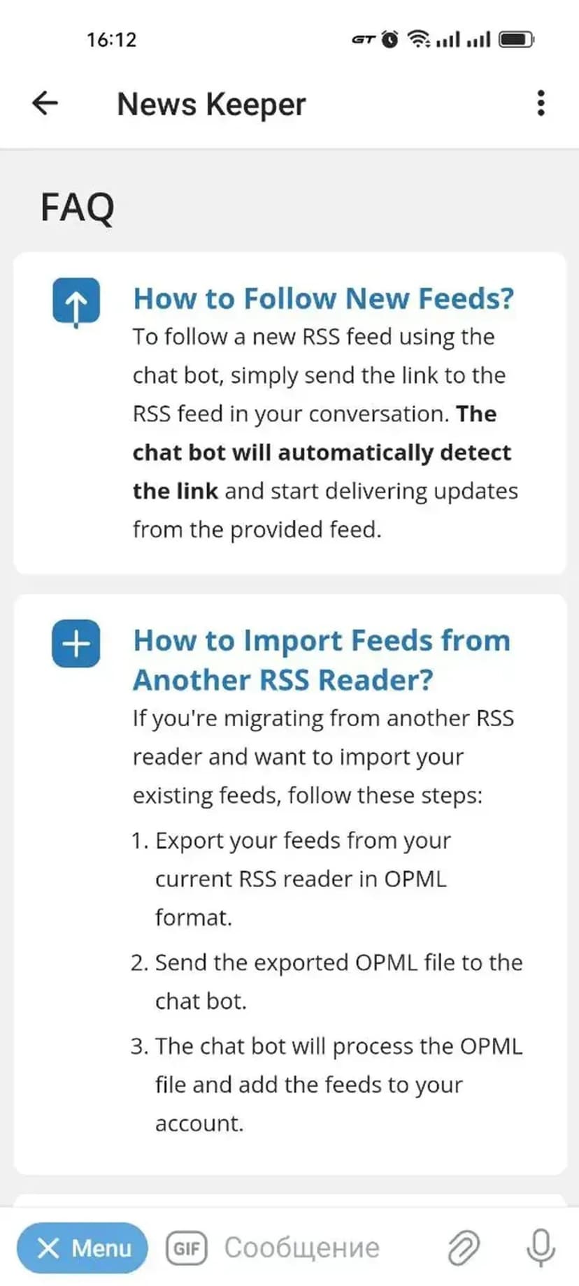 News Keeper | RSS Reader собирает новости из ваших RSS‑каналов, присылает уведомления о новых публикациях и позволяет читать статьи прямо в Telegram без перехода на сторонние сайты.