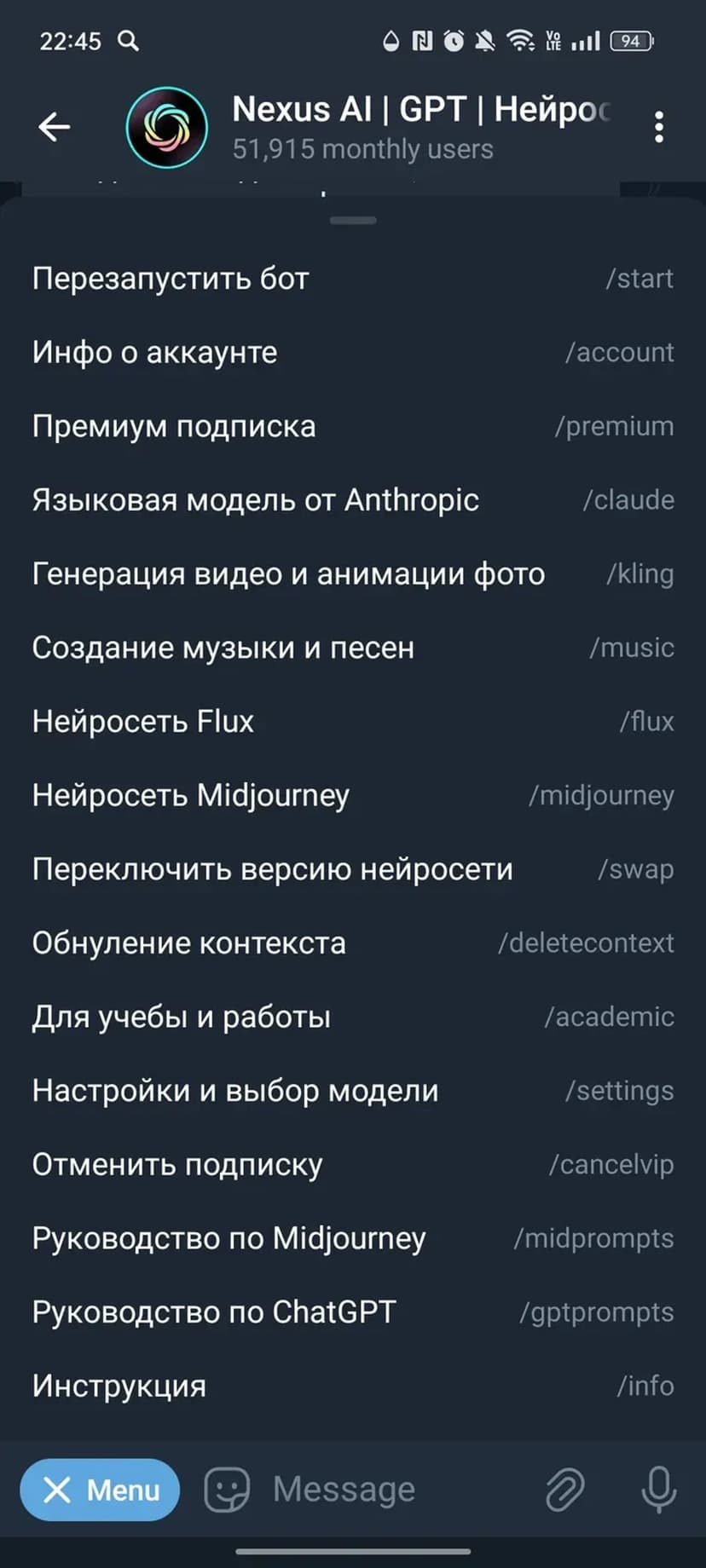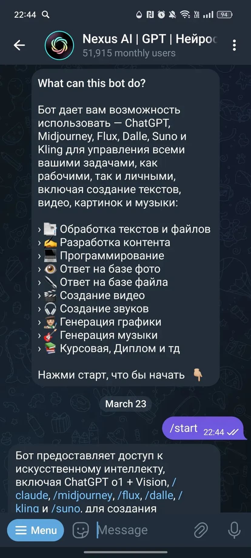 Поддерживает мультимодальные задачи: объединение разных типов данных в одном процессе генерации или анализа. Интерфейс реализован в виде Telegram‑бота — взаимодействие через команды и отправку файлов, что обеспечивает быстрый доступ к инструментам без установки дополнительного ПО.