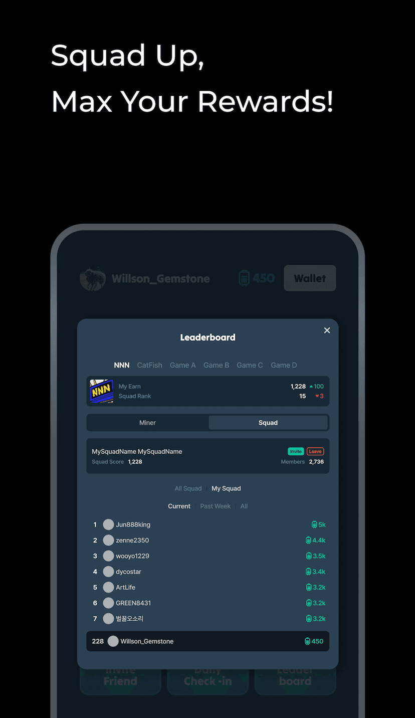 - Система приглашений и сквады для совместного заработка и участия в командных челленджах.