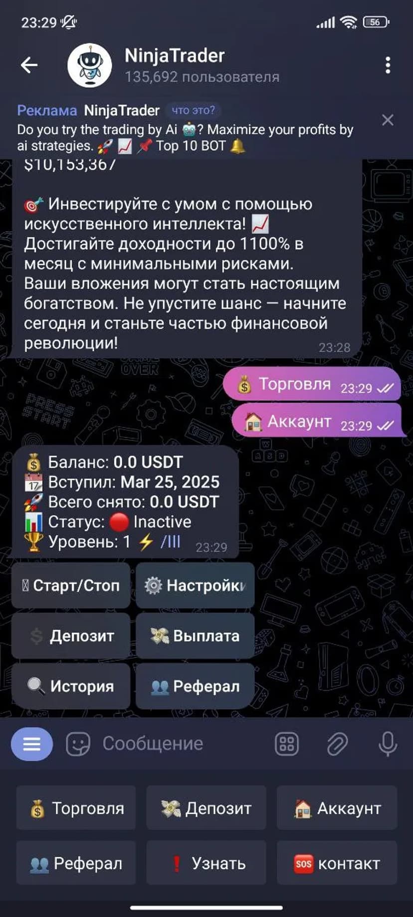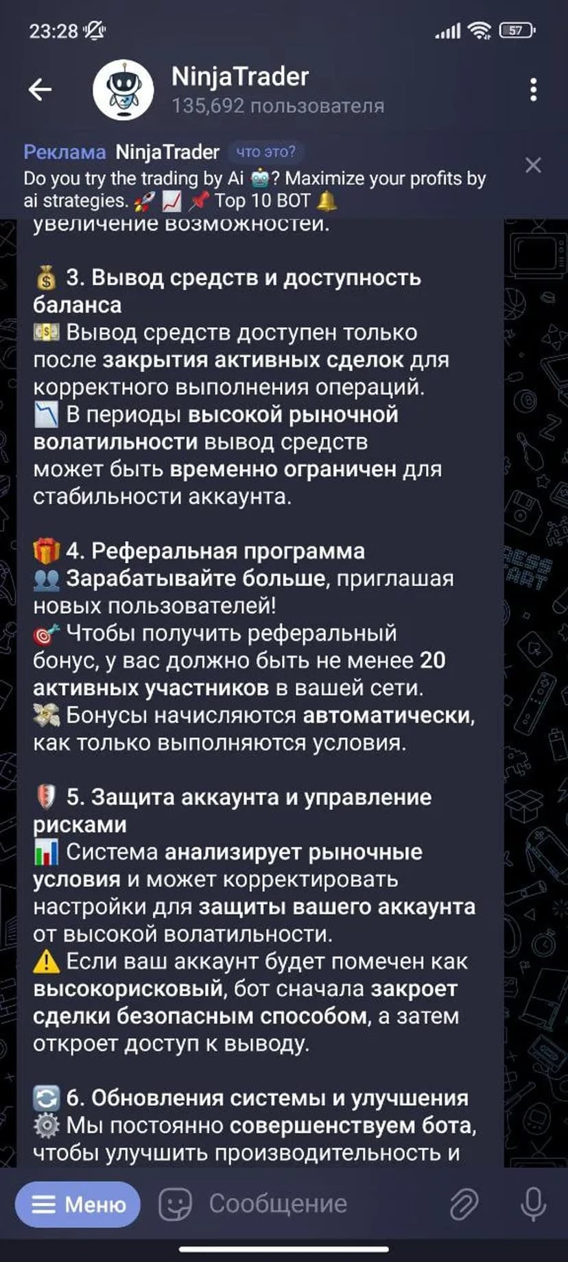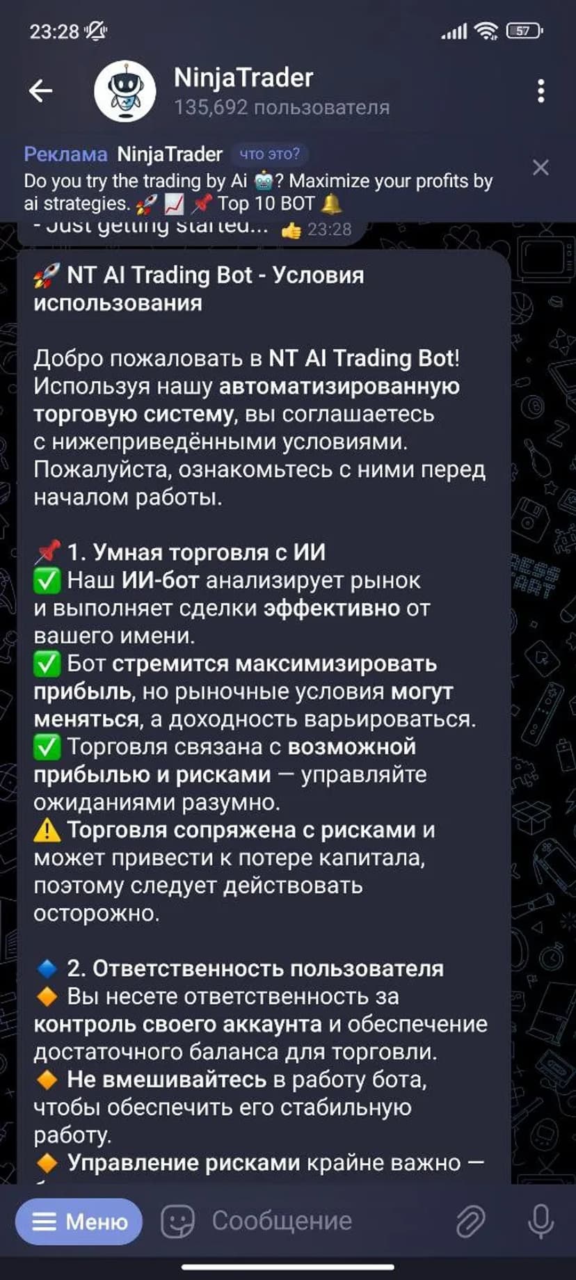 Пользователь обязан следить за балансом и не вмешиваться в работу системы. Бот регулярно обновляется, в периоды апдейтов отдельные функции могут быть ограничены. Активация подразумевает согласие с правилами и понимание связанных рисков.