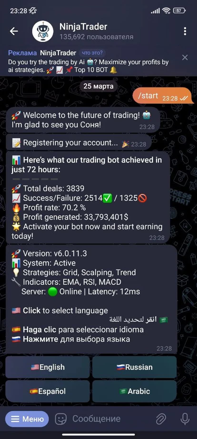 *Нажимая "Открыть в Telegram", вы перейдете к приложению NinjaTrader в мессенджере Telegram