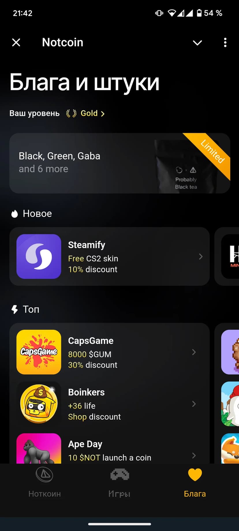 Маркетплейс «Блага и штуки» позволяет обменивать NOT на цифровые преимущества — скидки, внутриигровые бонусы и эксклюзивные товары. Примеры предложений: Steamify (скины и скидки), CapsGame (внутриигровая валюта), Boinkers (бонусы) и возможность запускать собственные токены через специальные кампании.