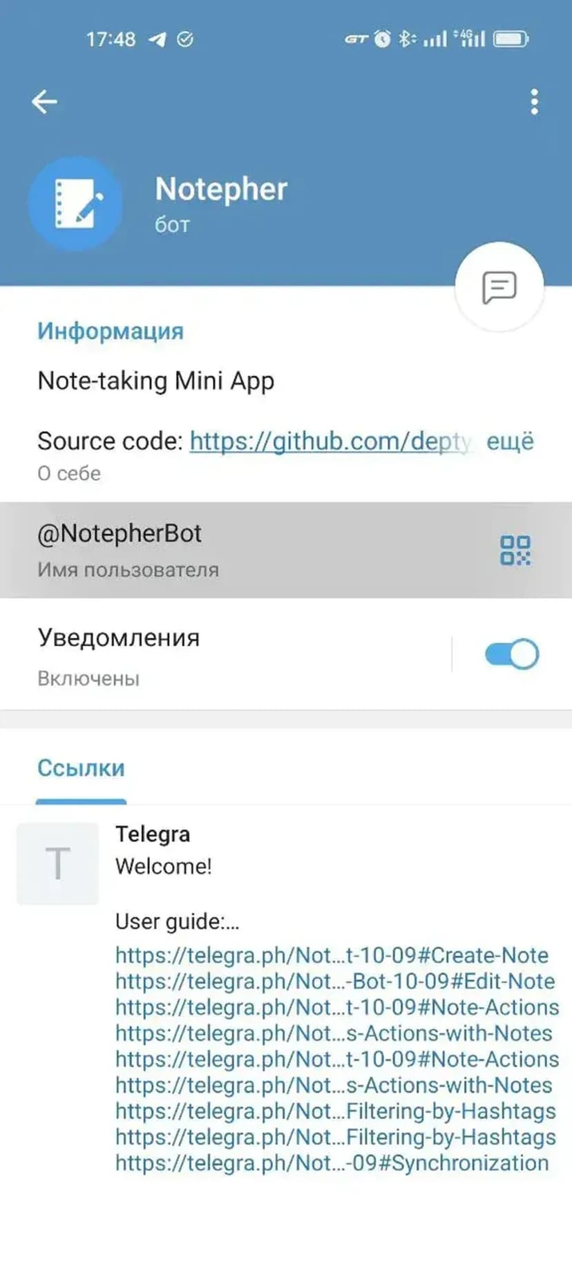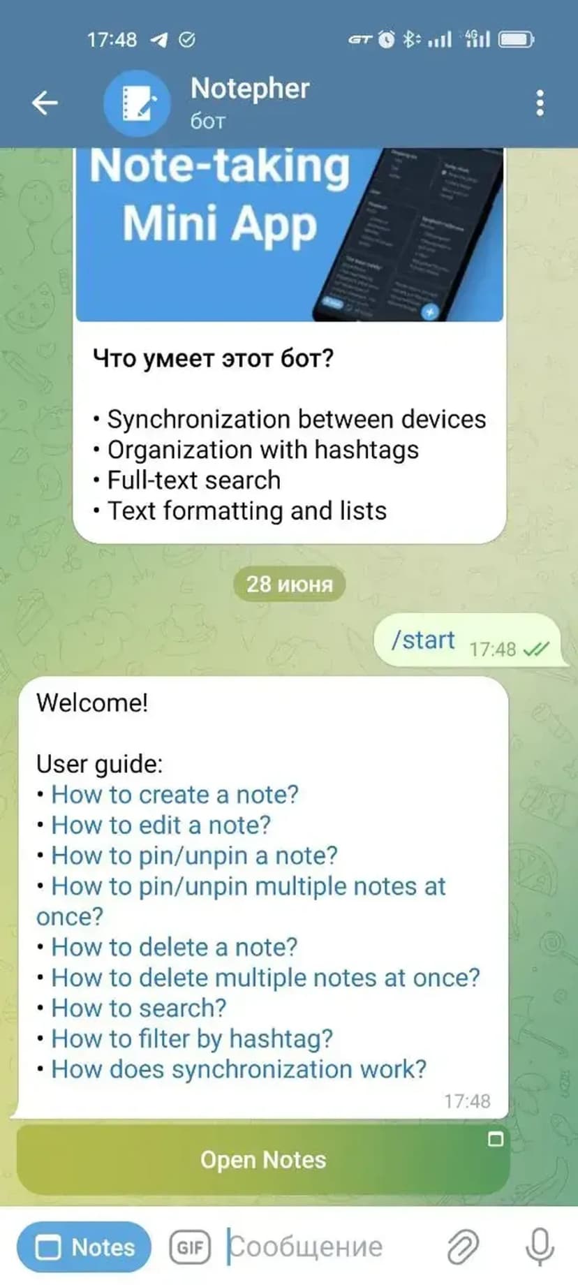 *Нажимая "Открыть в Telegram", вы перейдете к приложению Notepher в мессенджере Telegram