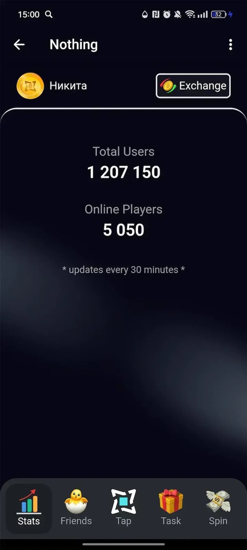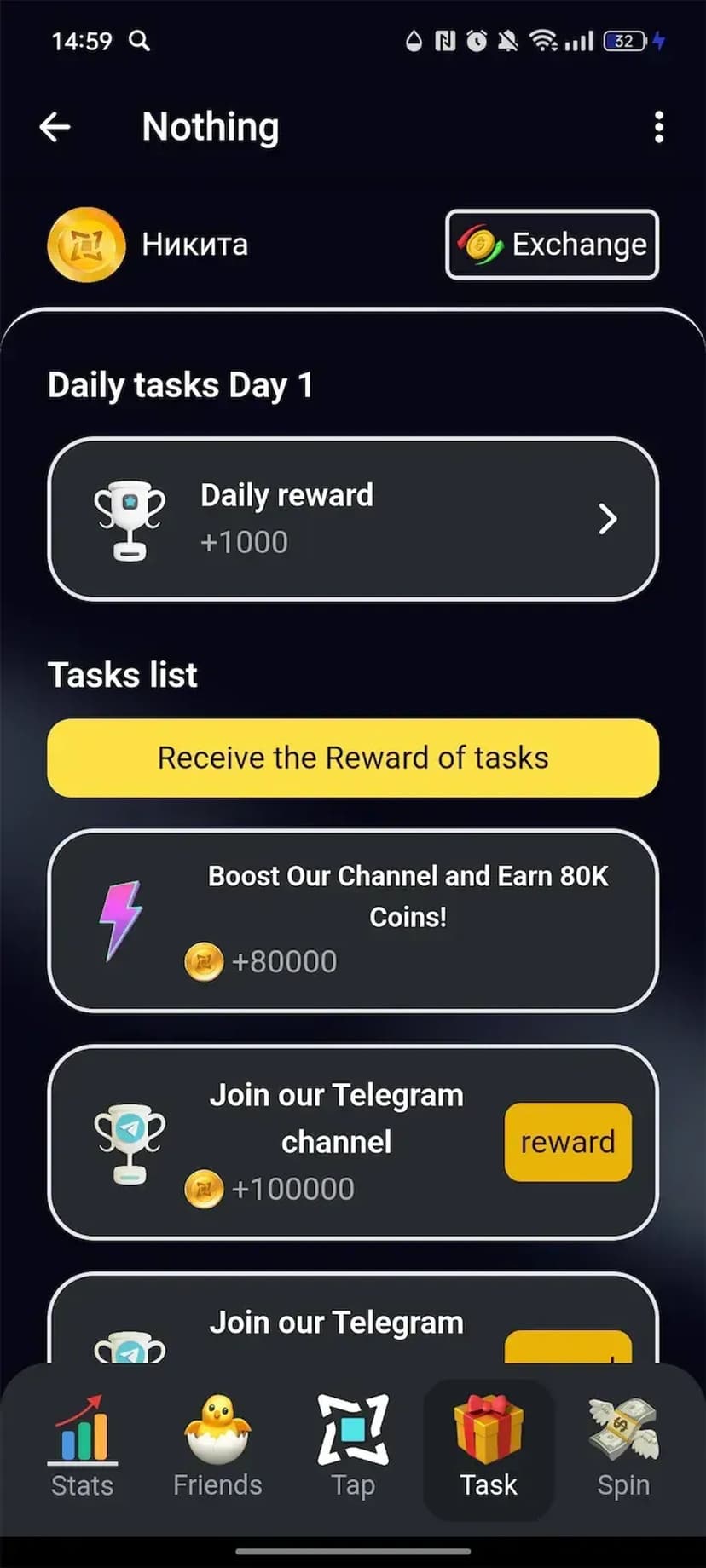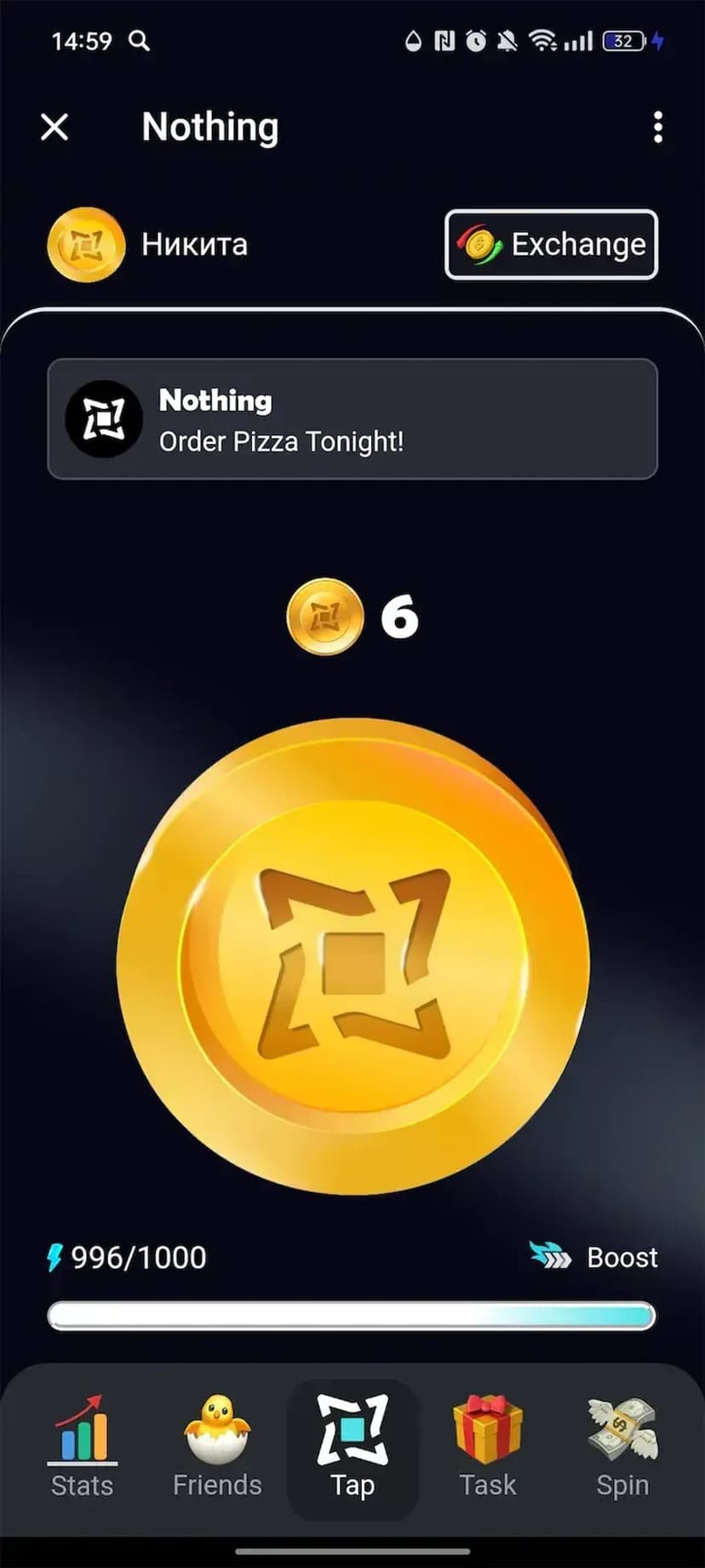 Nothing — мини-приложение, которое делает криптовалютную активность игровой: за каждое взаимодействие начисляются токены. Основные способы получения — тап по экрану, выполнение небольших заданий и приглашение друзей.
