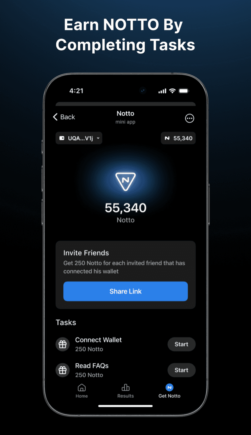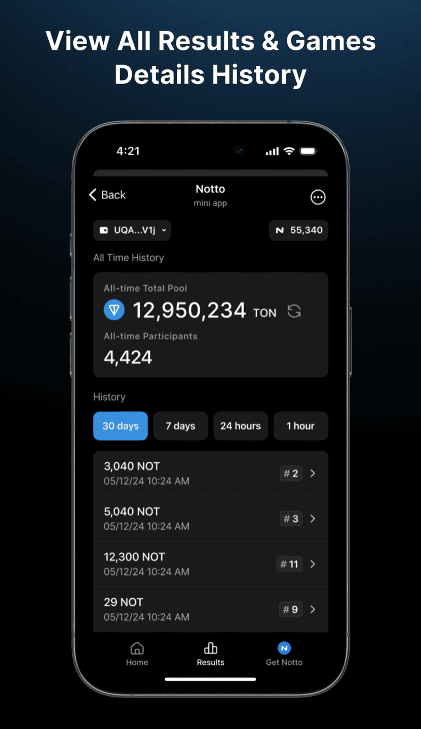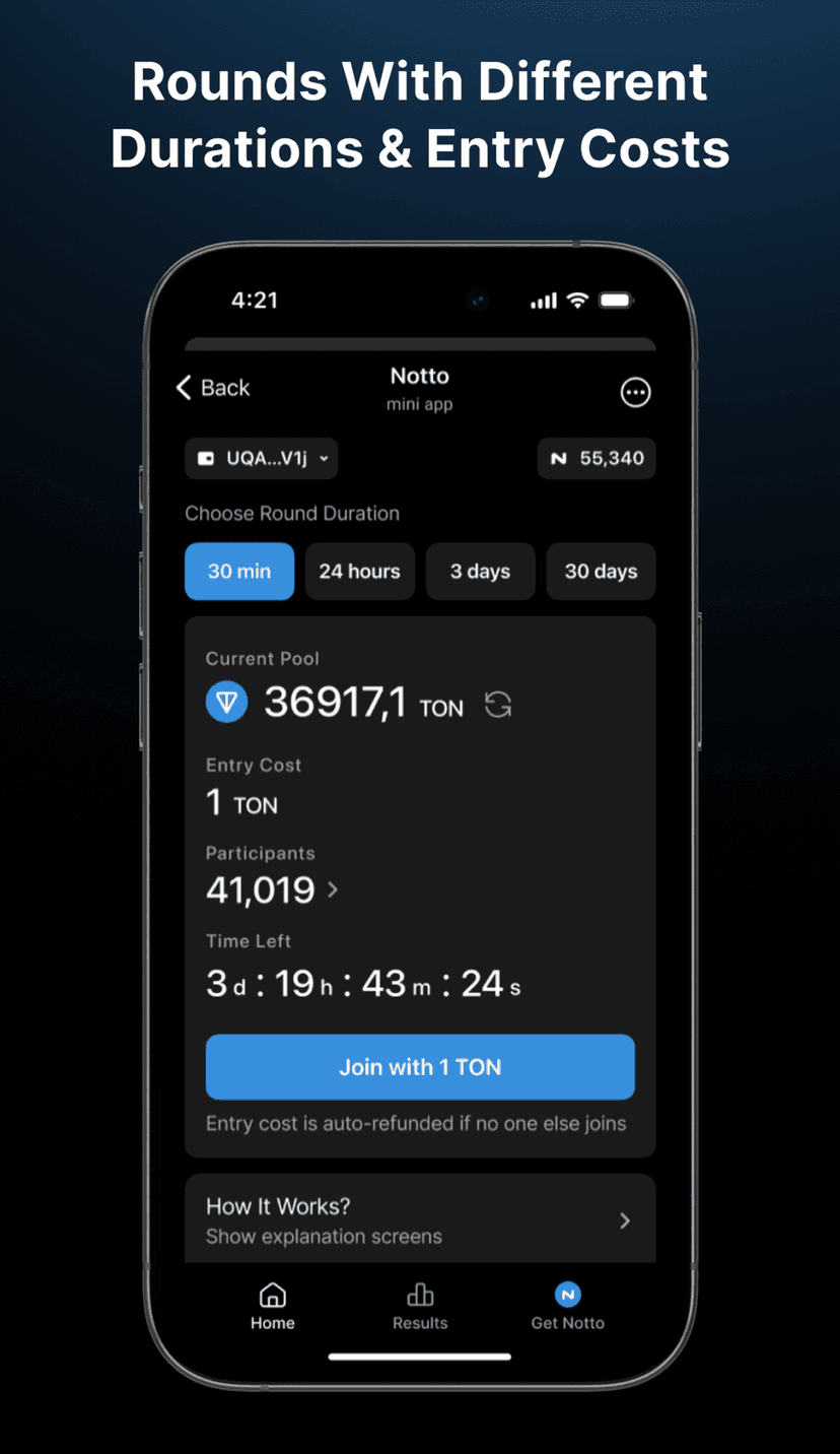 Результаты публикуются мгновенно, а алгоритм выбора победителя доступен для аудита, что делает Notto удобным вариантом для пользователей TON, ценящих автоматизацию и открытость процессов.