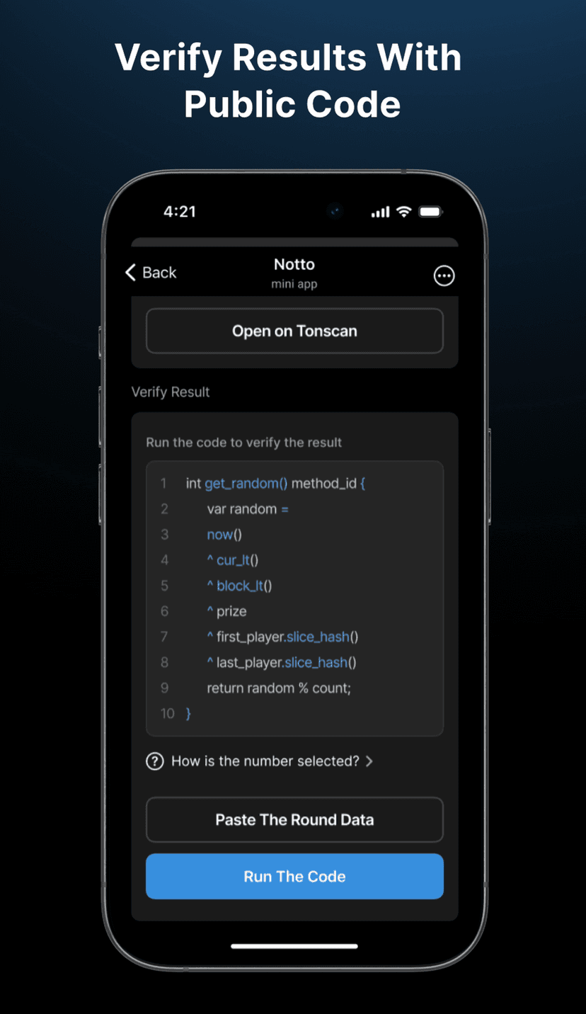 Все транзакции, логика выбора победителя и возвраты реализованы через смарт‑контракты TON. Действия можно проверить в приложении и через публичные блокчейн‑эксплореры, что обеспечивает верифицируемость результатов и повышает прозрачность по сравнению с централизованными лотереями.