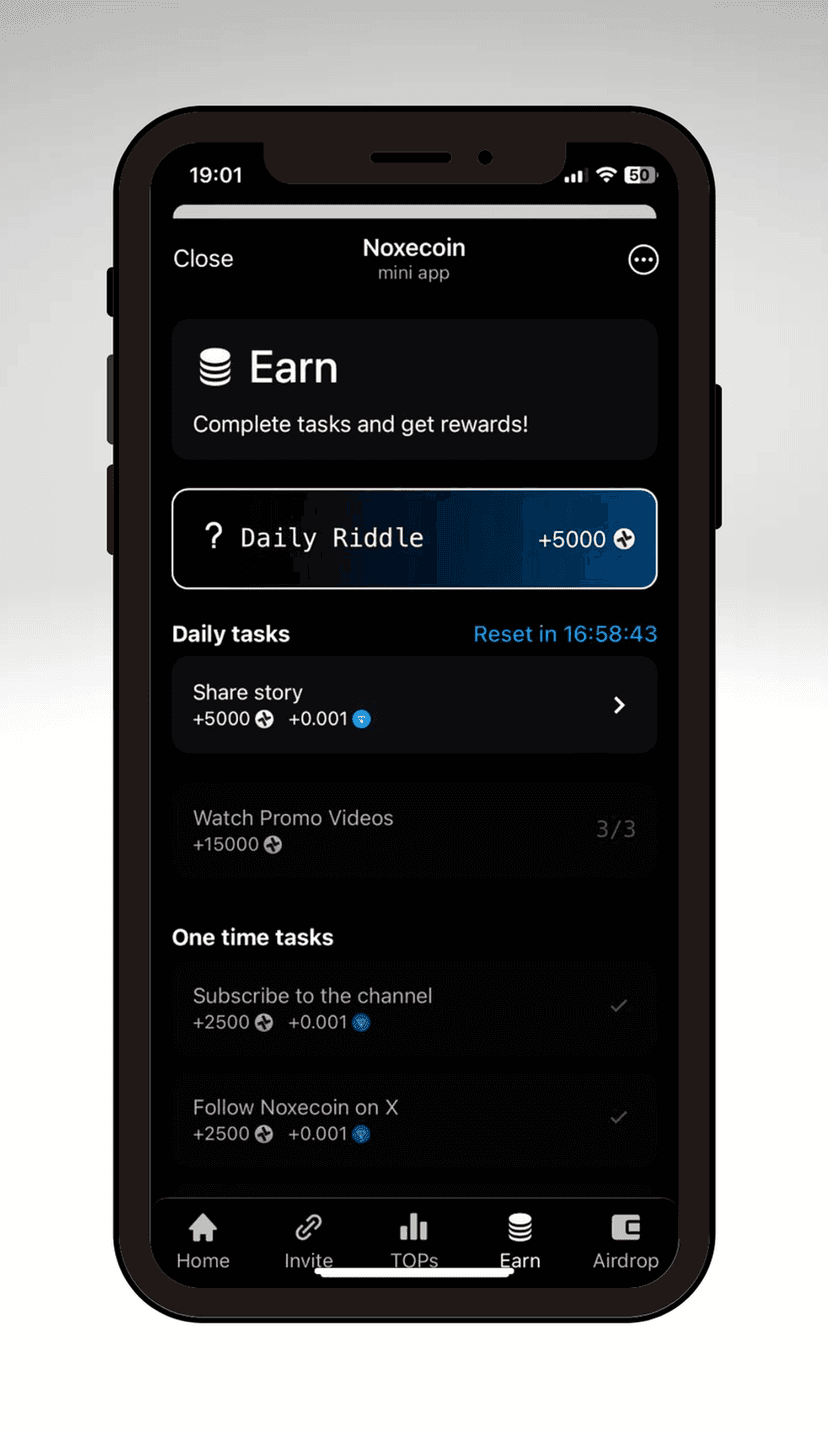 Noxecoin — геймифицированное мини‑приложение в Telegram, которое позволяет получать криптовалютные вознаграждения через внутриигровые монеты. Пользователи зарабатывают монеты, выполняя ежедневные задания, участвуя в различных активностях и взаимодействуя с встроенной системой майнинга.