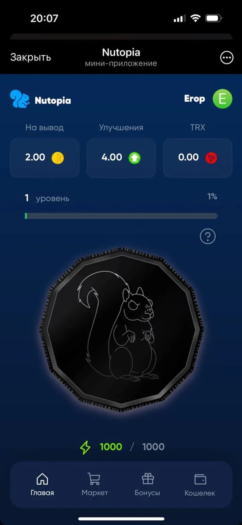 Nutopia — мини‑игра внутри Telegram, в которой игроки становятся частью тайного сообщества белок и борются за влияние в игровом мире. Проект реализован как бот с мини‑приложением, использующим WebApp API для интерактивного интерфейса и обмена событиями в реальном времени.