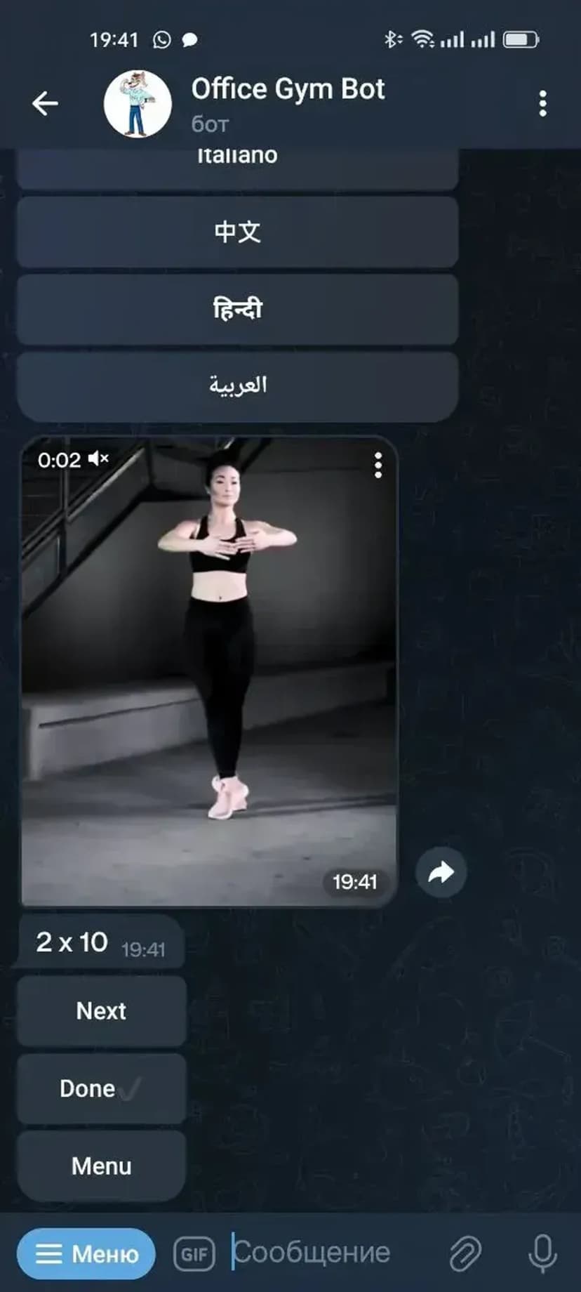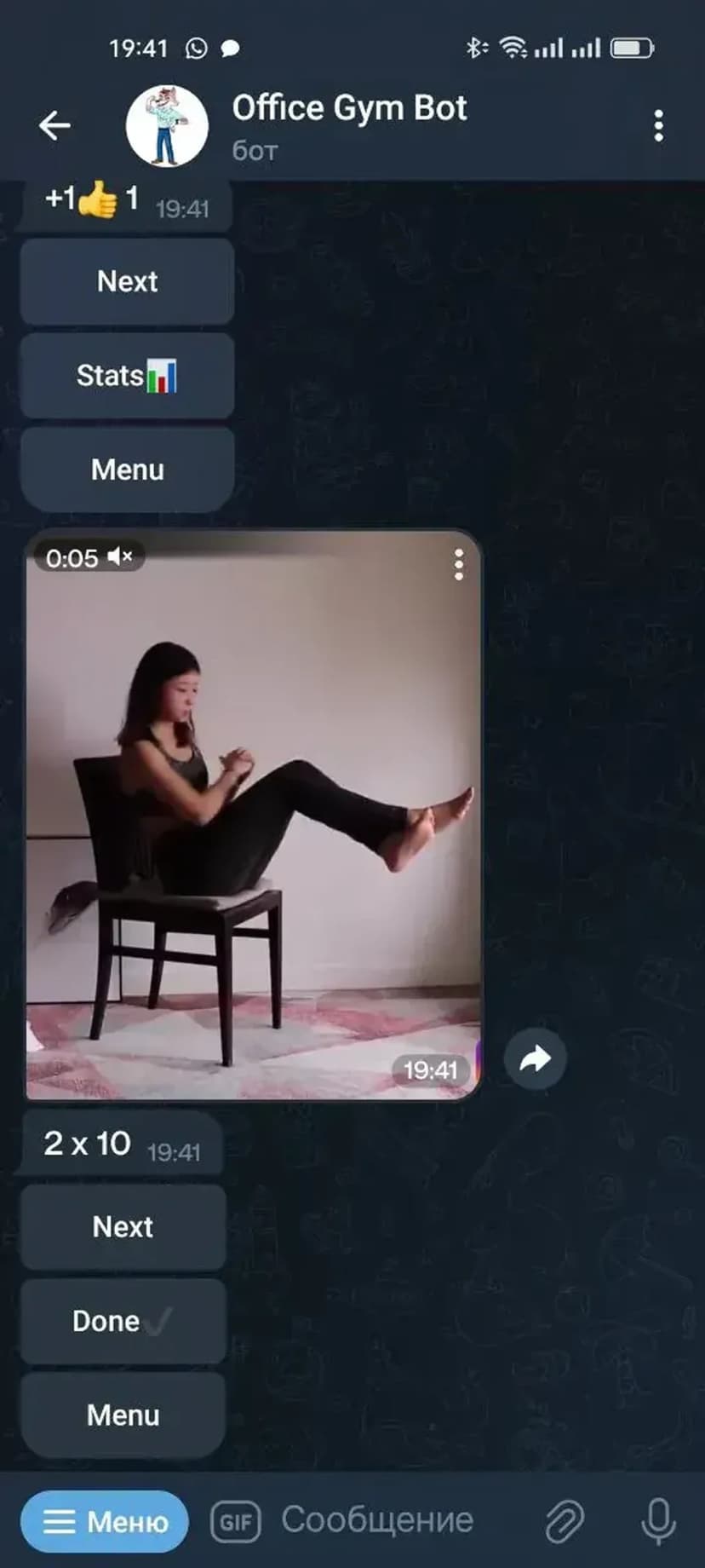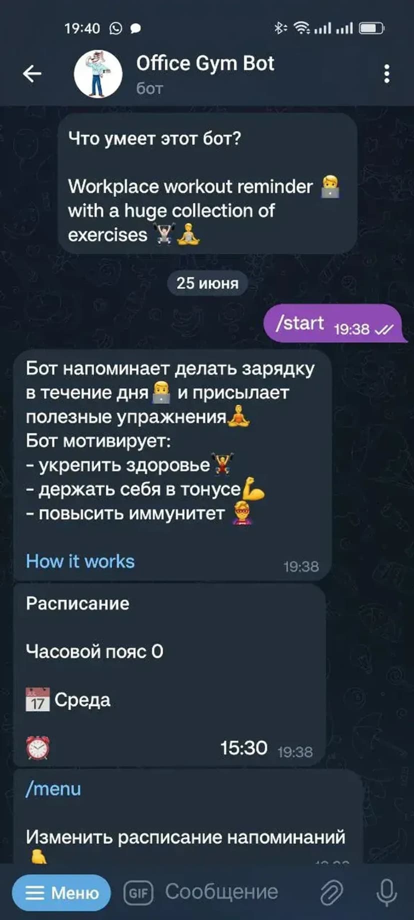 Office Gym Bot напоминает о выполнении коротких упражнений в течение рабочего дня — особенно полезно при сидячем образе жизни и длительной работе за компьютером.