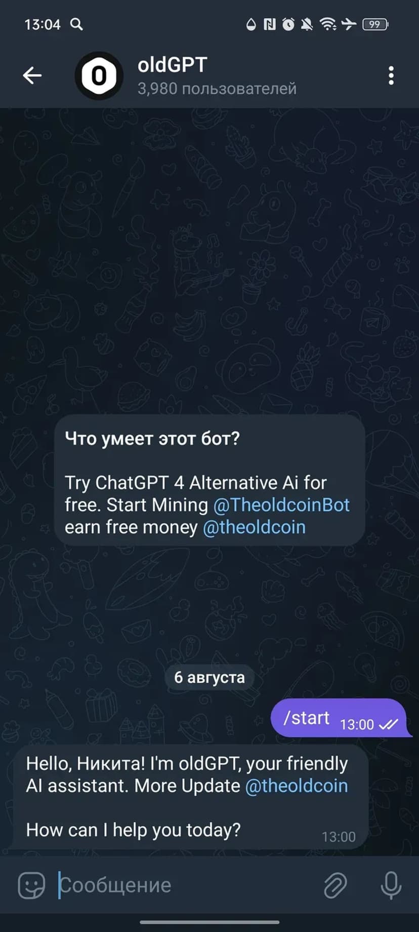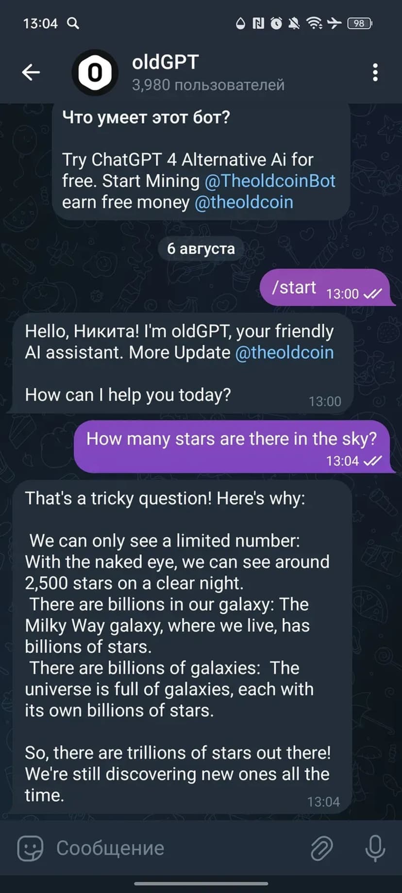 *Нажимая "Открыть в Telegram", вы перейдете к приложению oldGPT в мессенджере Telegram