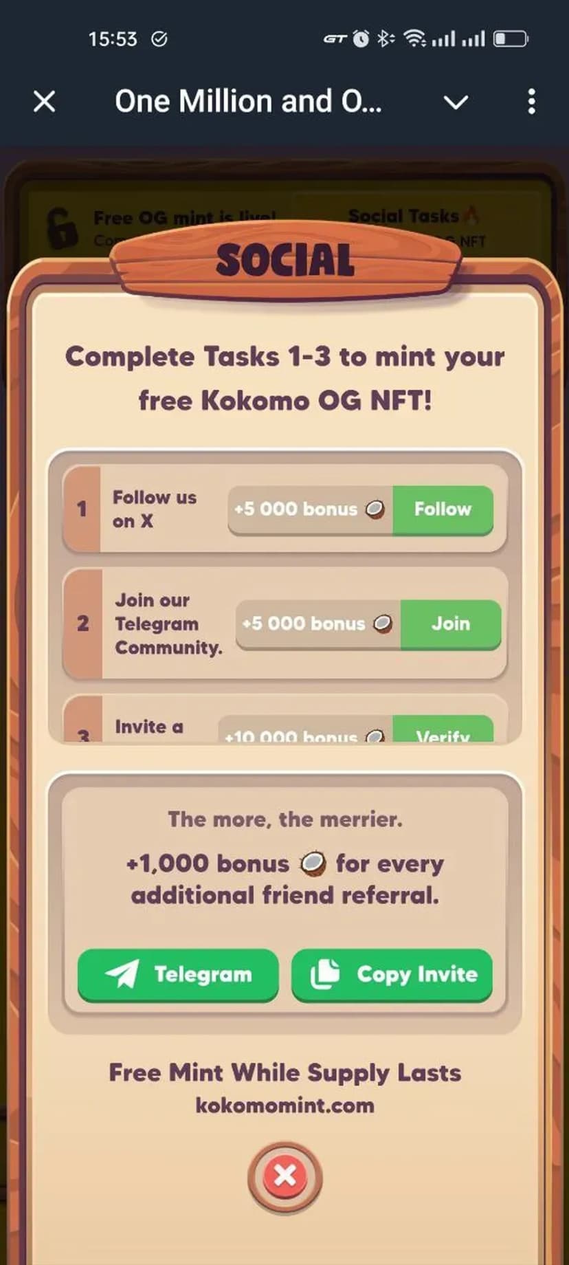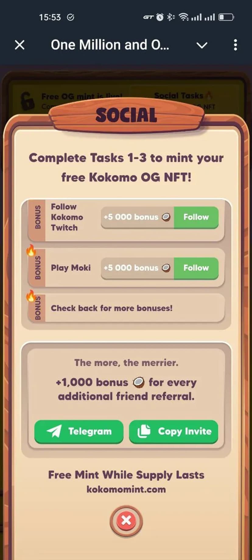 *Нажимая "Открыть в Telegram", вы перейдете к приложению One Million and One Kokos в мессенджере Telegram